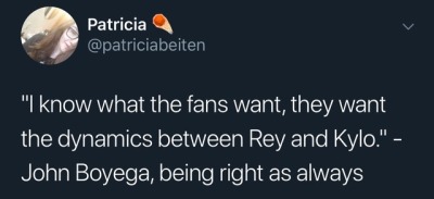 >Boyega says. “I thought it was going to be ‘Star Wars: Heirs to the Force.’ For some reason I just had that title in my head, that it would be something along those lines. >“This is just very specific: ‘Rise of Skywalker.’ And I don’t know what it actually means. Bearing in mind that I’m a part of it, but there were certain changes to the script while we’re filming and I’m not in a lot of the scenes that Rey has with Kylo Ren. So my curiosity just hit the roof.”