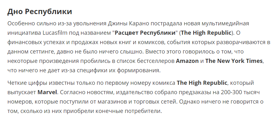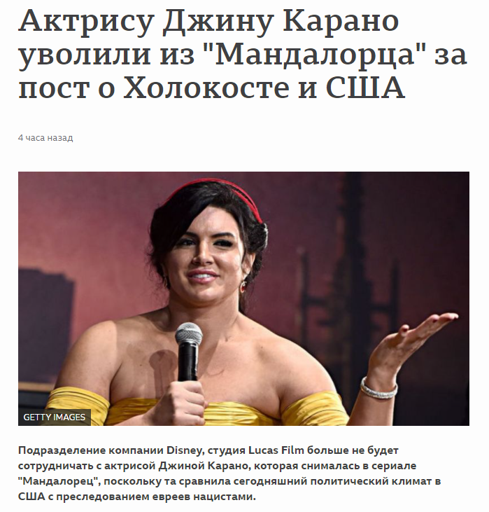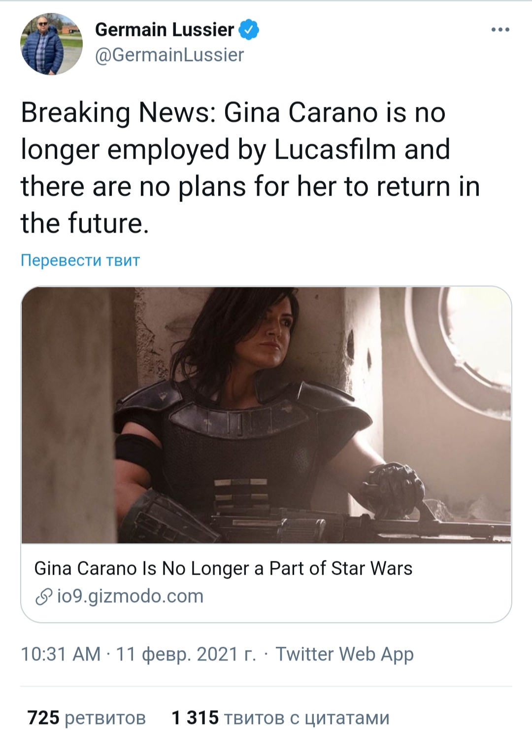 А вообще, Дисней никого не прогоняет навсегда. С Джеймсом Ганном вон какой был скандал. Пидорнули его, а потом сами же обратно позвали, когда всё улеглось. Рея Парка тоже пидорнули ненадолго, а теперь вон он снова Дарт Мол. Так же и с Карано будет. Через пару лет внезапно вернётся в Мандалорца из "командировки".