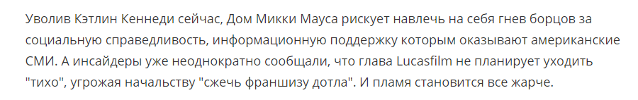 >>190372 >Глава Walt Disney Company, Боб Чапек, подтвердил, что нет никаких планов по смещению Кейтлин Кеннеди с поста президента Lucasfilm. >Во время собрания акционеров, Боба Чапека спросили, заменил бы он Кейтлин на Джона Фавро или Дэйва Филони, на что он ответил: "Мы в восторге, что в нашей компании работают такие талантливые люди. Что касается Кейти, мы надеемся, что она будет управлять Lucasfilm на протяжении долгих лет."