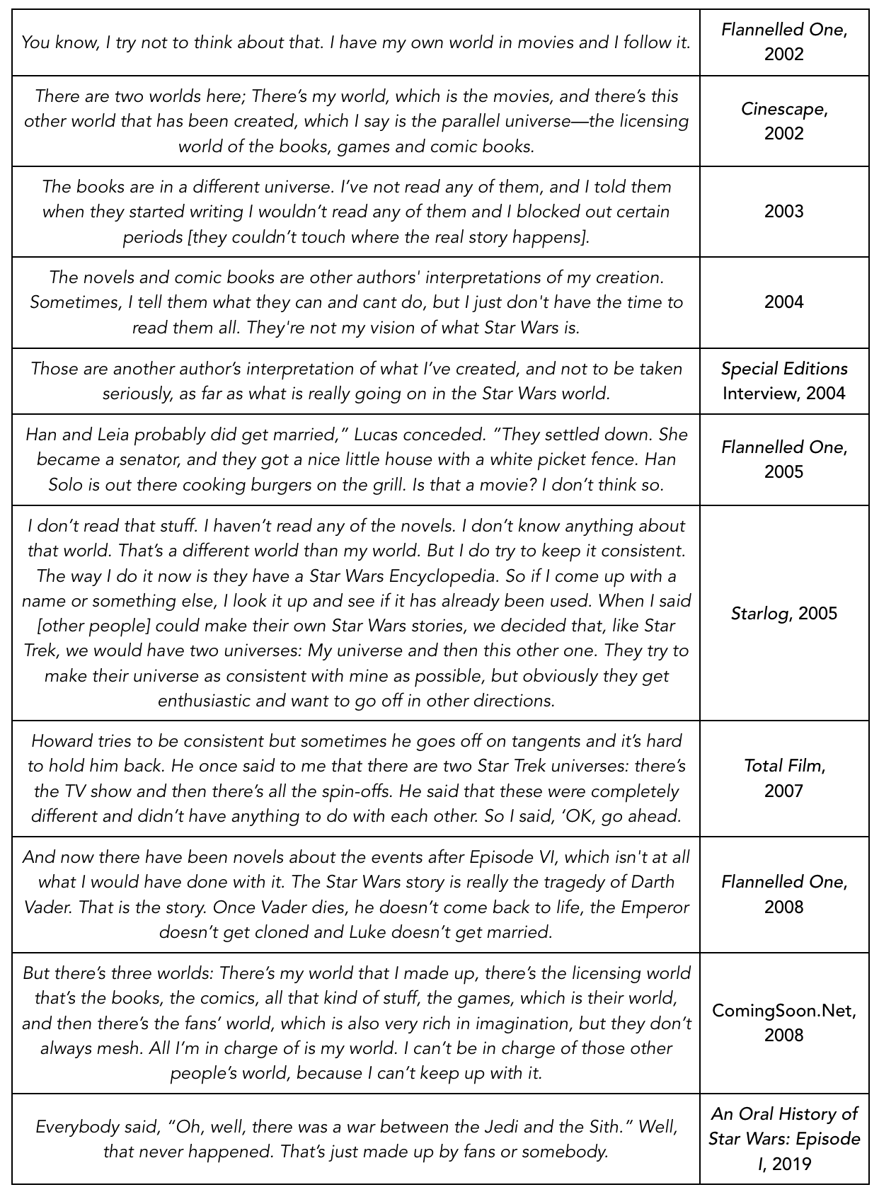 >Q: "What do you think of the Expanded Universe of books?" >A: "The books are in a different universe. I've not read any of them, and I told them when they started writing I wouldn't read any of them and I blocked out certain periods [they couldn't touch where the real story happens]." — George Lucas 2003