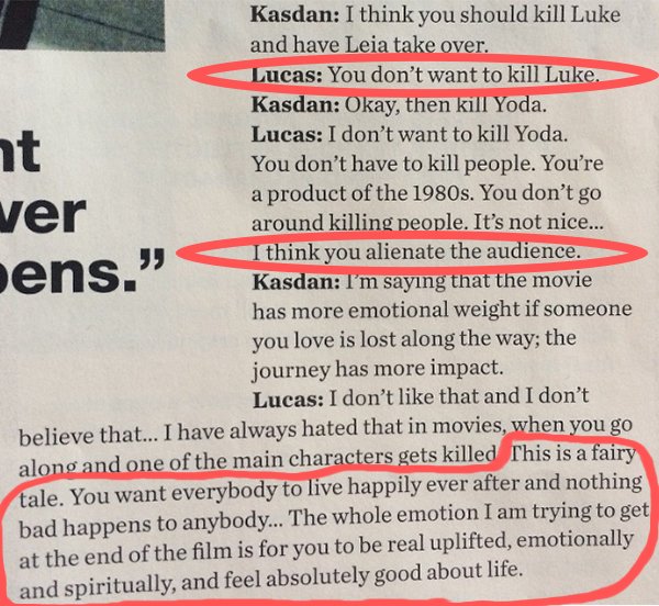 >Interviewer: "Do you think you'd have other people continue the Star Wars saga past Episode VI or turn some of the other material into films?" >Lucas: "But there's no story past Episode VI, there's just no story. It's a certain story about Anakin Skywalker and once Anakin Skywalker dies, that's kind of the end of the story. There is no story about Luke Skywalker, I mean apart from the books. But there's three worlds: There's my world that I made up, there's the licensing world that's the books, the comics, all that kind of stuff, the games, which is their world, and then there's the fans' world, which is also very rich in imagination, but they don't always mesh. All I'm in charge of is my world. I can't be in charge of those other people's world, because I can't keep up with it."