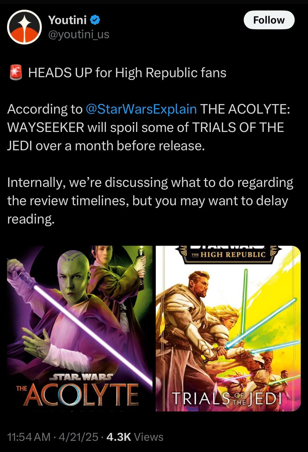 Даты выхода книг: 1 апреля - подростковый роман Клаудии Грей «На свет» 6 мая - детский роман Джустины Айлэнд "Доблестная Клятва" 6 мая - роман Джустины Айлэнд "Аколит: Искатель Пути" (приквел сериала) 17 июня - финал 3 фазы, взрослый роман Чарльза Соула "Испытания джедаев" 17 июня - артбук "The Acolyte: The Visual Guide" 1 июля - артбук "The Art of Star Wars: The High Republic: Volume II" 29 июля - роман Тессы Грантон "Аколит: Хрустальная корона" (приквел сериала)