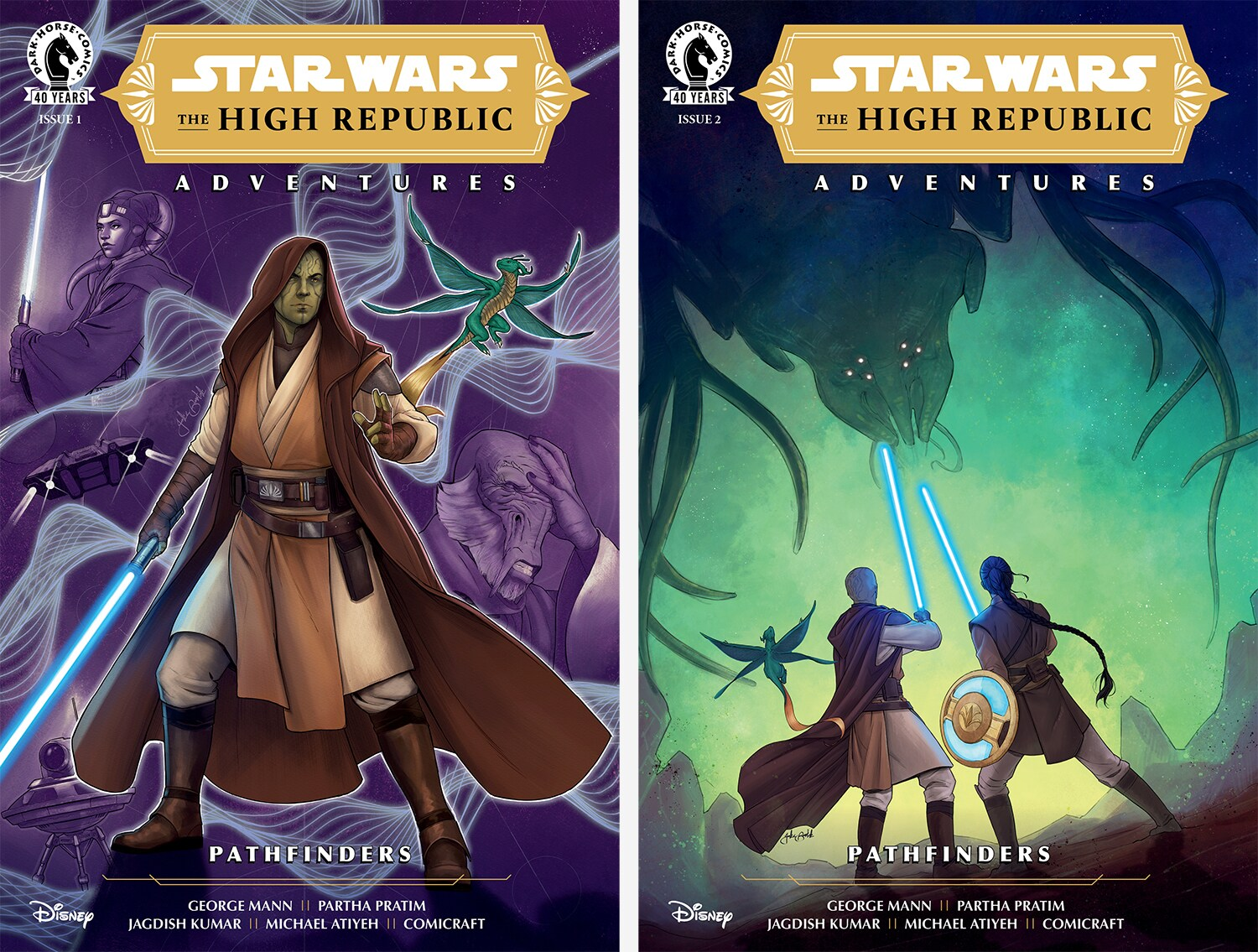 >Return to the era of The High Republic with the new Pathfinders miniseries from Dark Horse Comics! Lucasfilm revealed the covers of the first two issues, which follows a brand-new team of Republic Pathfinders as they are dispatched to a distant corner of the galaxy to investigate the strange death of a Jedi Master. Writer George Mann and artists Partha Pratim, Jagdish Kumar, Michael Atiyeh, and Comicraft make up the creative team for this upcoming adventure, which takes place about 20 years after Phase II.