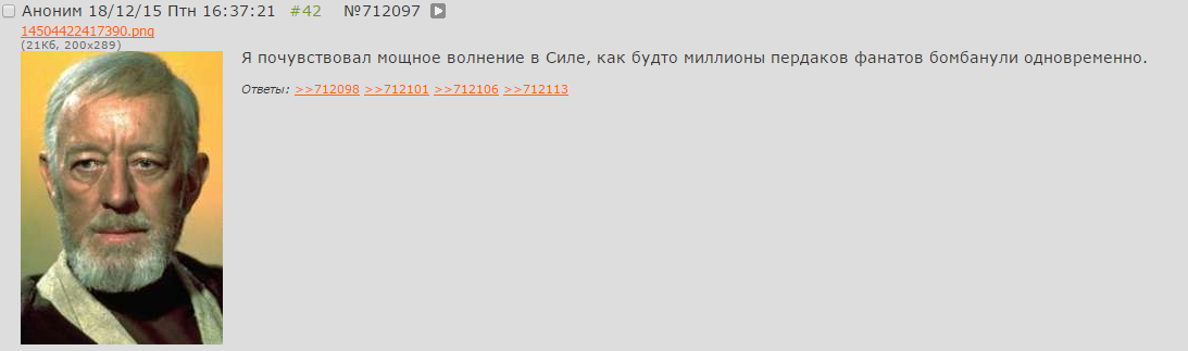 >>212969 >Что вообще должно произойти, чтобы ты мнение изменил? Уже ничего. В 1999 году Лукас гарантированно убил недоперсонажа Чмола оторвав ему жопу и бросив остатки в пропасть с огромной высоты, падение с которой очевидно пережить невозможно. Да еще и куда-то в реакторную зону, где радиация / высокое напряжение и прочие приятные вещи.