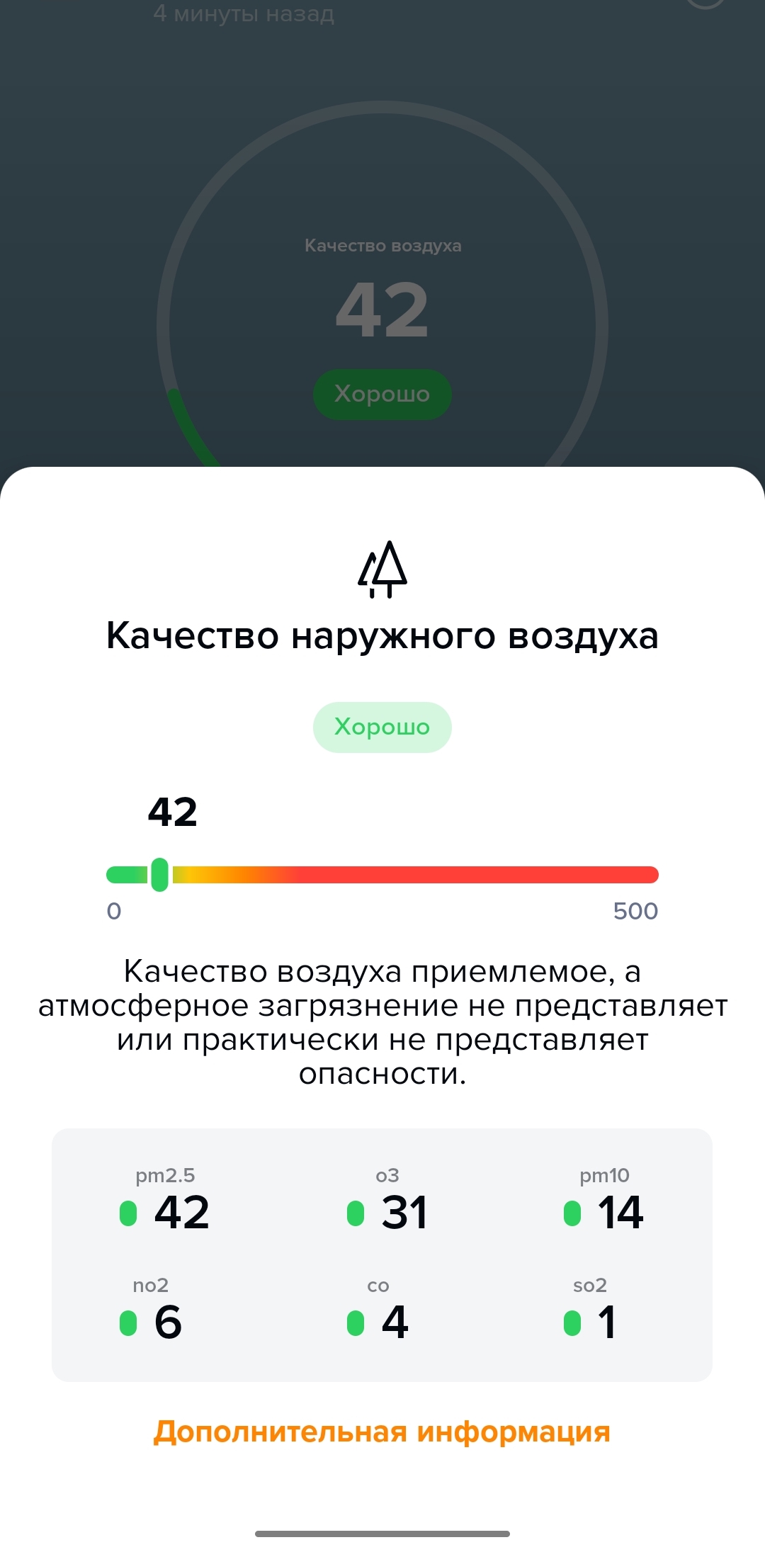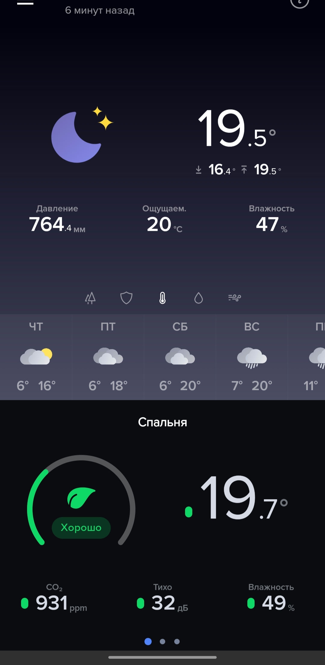 Продолжаю изучение метеостанции. Пока доволен. Узнал, что наружный датчик тоже измеряет качество воздуха (1 и 2 пик). Третий пик после ночи сна в спальне с закрытыми окнами и дверьми. Четвертый после 10 минут проветривания (открытия окна) комнаты. Показания меняются ощутимо быстро (2-3 минуты). Во общем метеостанция, как по мне, очень недооцененный в обществе продукт.