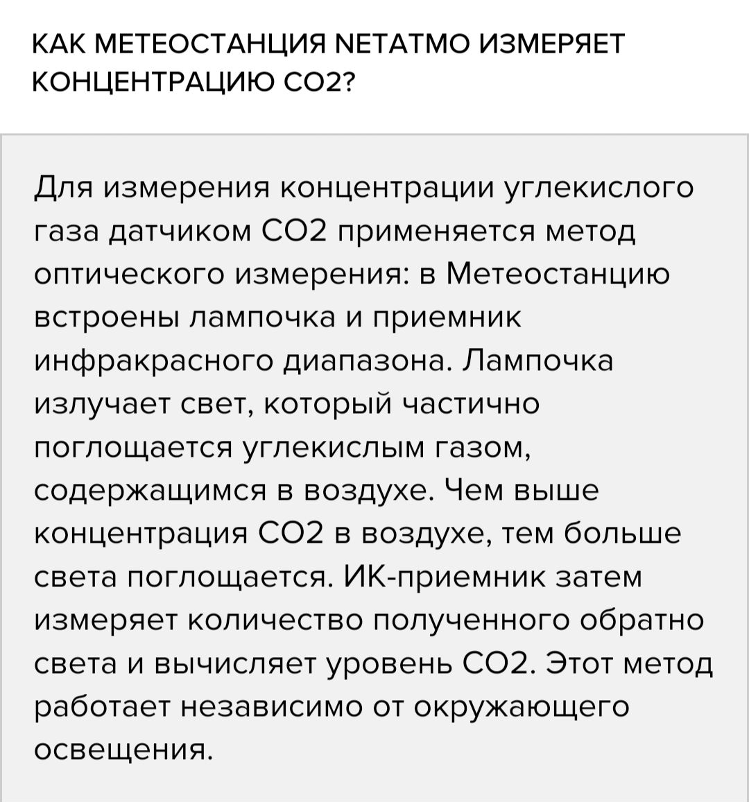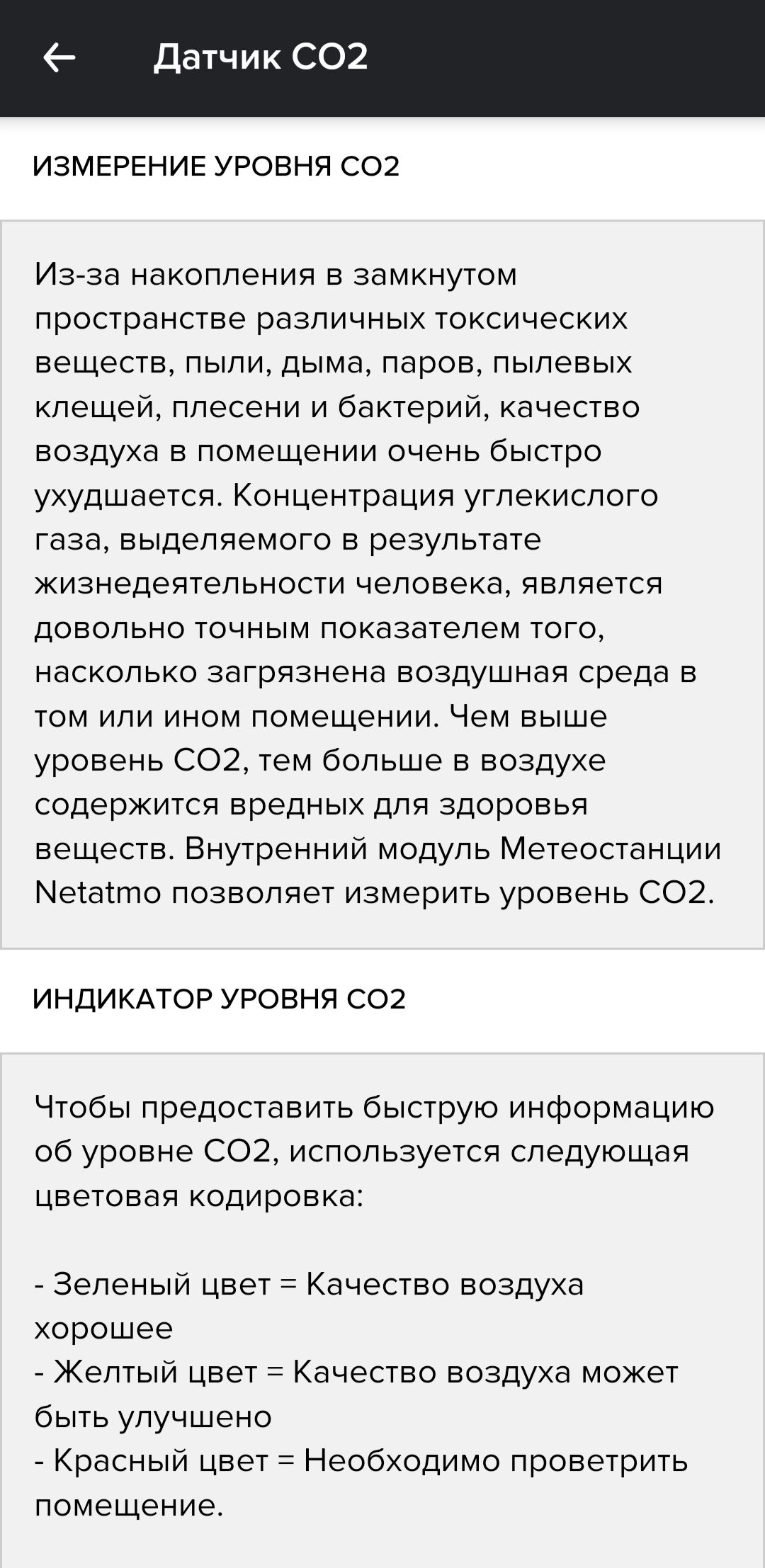 > У самого СО2 датчик (NDIR проф.класса) стоит в самодельной министанции от знакомого. Как я понял, метод измерения в Netatmo достаточно не точный (пока не вникал в датчики СО2).