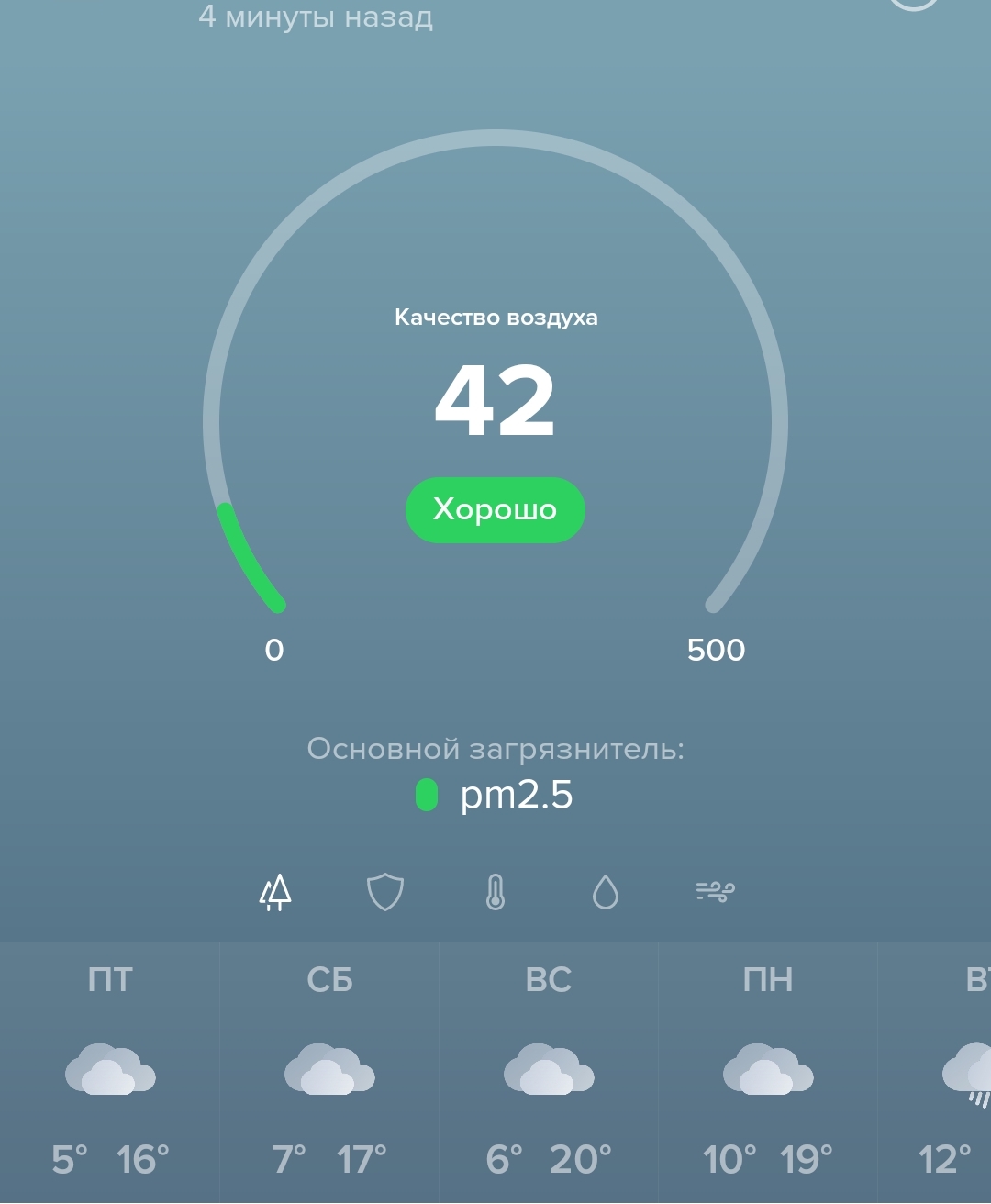 К стати, на пиктограмме как мы видим текущая погода - типа облачно. Вышел посмотреть в окно и реально все небо затянуто облаками. Берет информацию она с каких-то своих источников.