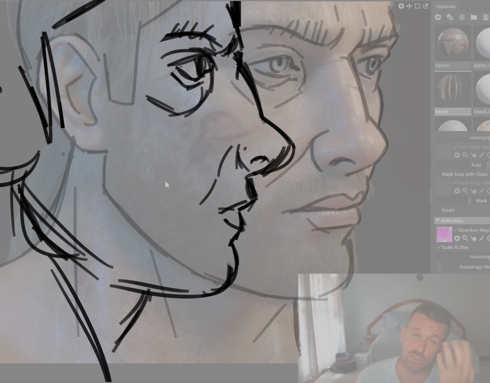 >>320800 Круто, нашел таки как делать налокотник? Впечатление портят разве только то ли отсутствующие то ли съеденные плохим затенением брови и надбровные дуги со стороны висков. Еще Странная линия челюсти, что продолжается за ухо, а не идет к самому его низу.