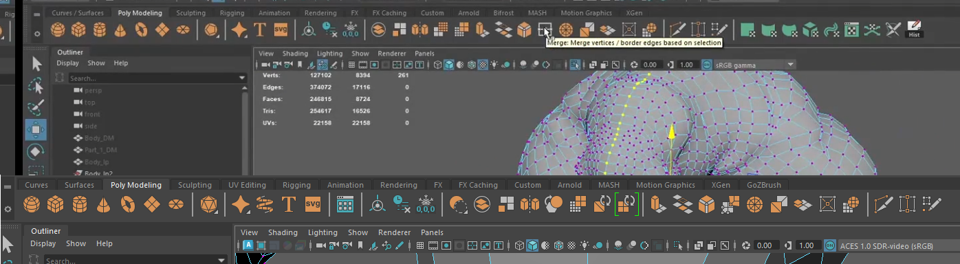1. На видео автор одной рамочкой может выбирать все вертексы, включая те что сзади модели, а у меня так не получается. Как сделать чтобы было так же? Автор в курсе не проговаривает этот момент, а он важный т.к. без него невозможно объеденить половинки, зеркальные вертексы после combine просто не выбираются. Скриншоты 1-3 2. У автора в видео есть кнопка merge vertex, у меня ее нет в версии 2024 года. Это аддон или в новых версиях майи поменяли принцип мерджа? Пробовал другие варианты нажимать, но там все упирается в первую проблему, не выделяются оба вертекса половина и поэтому мердж не происходит вообще.