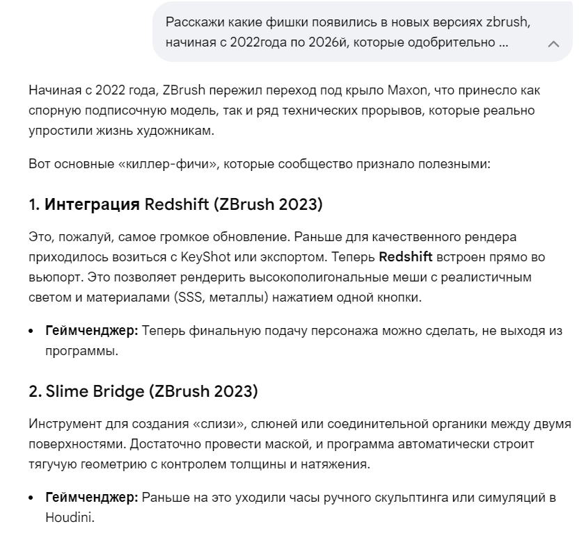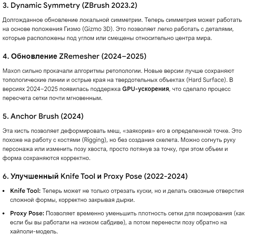 Анончики, какой версией Zbrush пользуетесь ? Попробовал установить с последнюю версию 2025.3 и разницы кроме того что увеличили кнопочку zremesher, которая и без того была гигантской, не заметил. Загружаться zbrush стал почти минуту, последняя версия 2022.0.5 которой пользовался грузится не больше 10 секунд. Что-то мне подсказывает, что смысла переходить на новую версию и не было, кому нужен встроенный рендер redshift вообще не понятно.