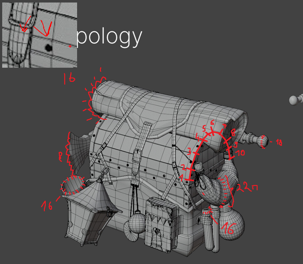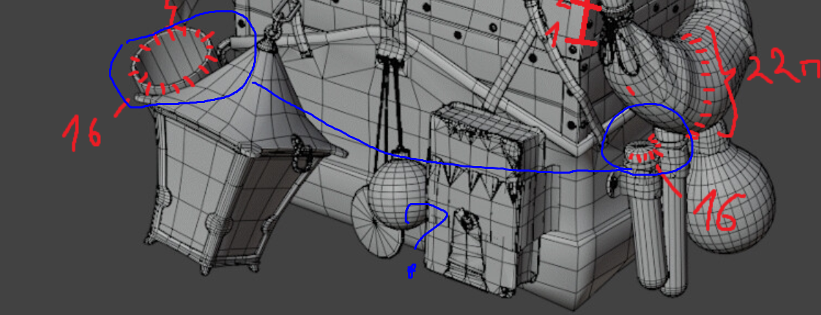 Вот смотри у нас есть самый большой объект - сундук, на его крышку, чел потратил чамфер по 5 с каждой стороны и видем всего 10 поликов ото самый большой объект в сцене. Дальше мы видем ткань, которая уже почти в полтора раза больше детализацией. После идет сфера посоха какого то, она уже 18 поликов, без упрощения, после нее идет стакан, который имеет всего 16 граней после какой то мелкой ручки и так можно продолжать бесконечно. Отдельно я в левом верхнем углу, приблизил скрин с разницей в детализации ебаного болта который жирнее крышки сундука, я уже не говорю про веревки, которые просто черные, там дохуища полигонов мб они и составляют 1/5 всего поликаунта