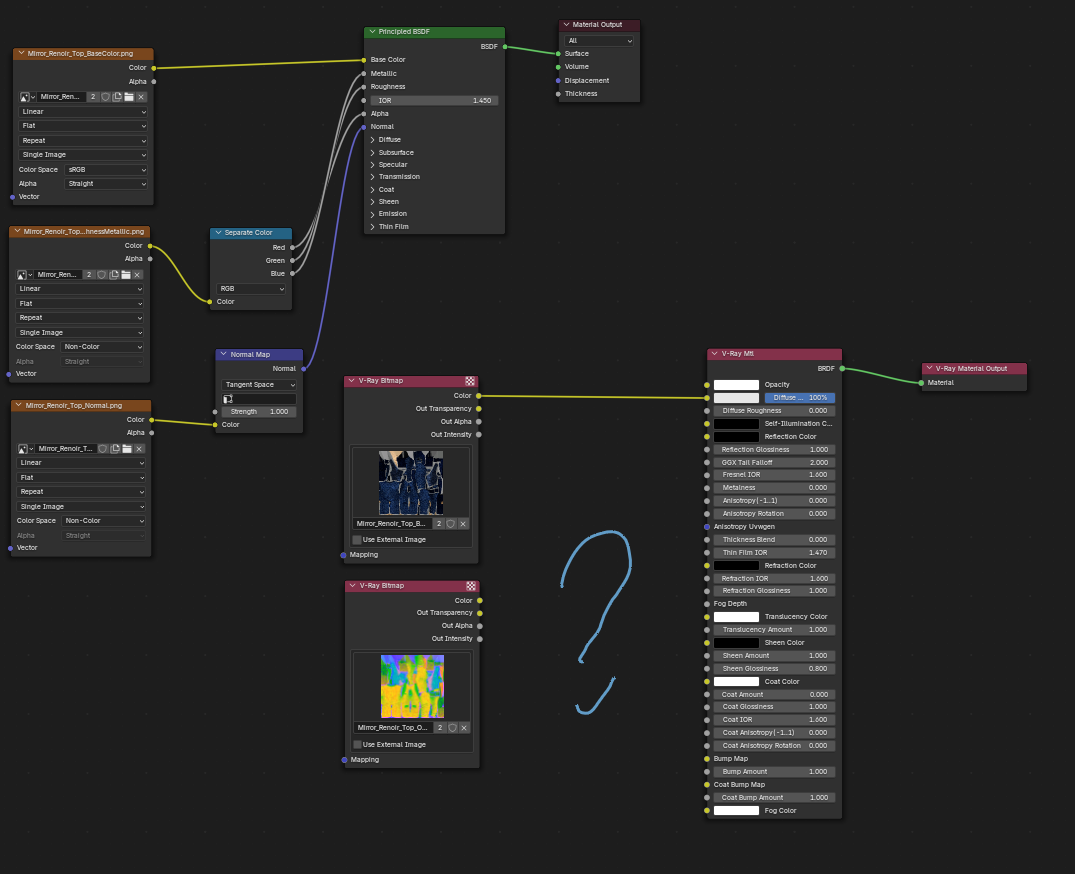 Поставил v-ray, ищу аналог ноды separate RGB. Нужна для ORM/RMAO текстур, в отдельных каналах лежат opacity-roughness-metalness (пикрил), или roughness-metalness-AO. И combine RGB тоже понадобится