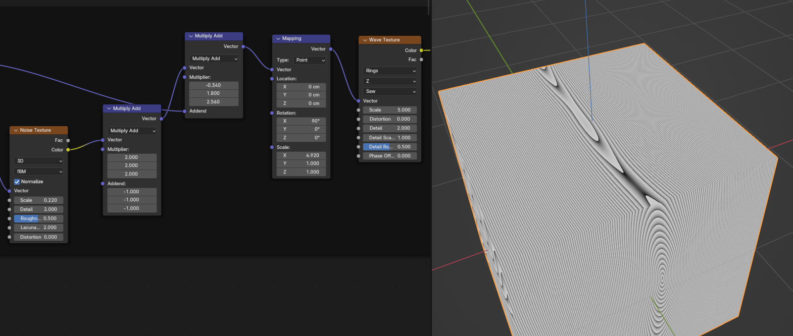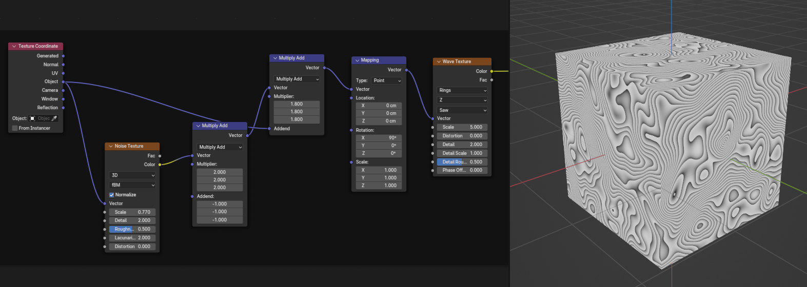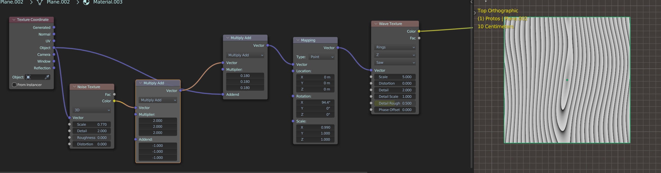 >>346726 но вообще говоря такая структура образуется от косого среза радиальных колец. Ну то есть ты должен прям в пространстве создать кольца как у дерева немного неровные, сужающиеся в одну сторону (искажением пространства) и срезать чутка криво (вращение пространства относительно плоскости среза)