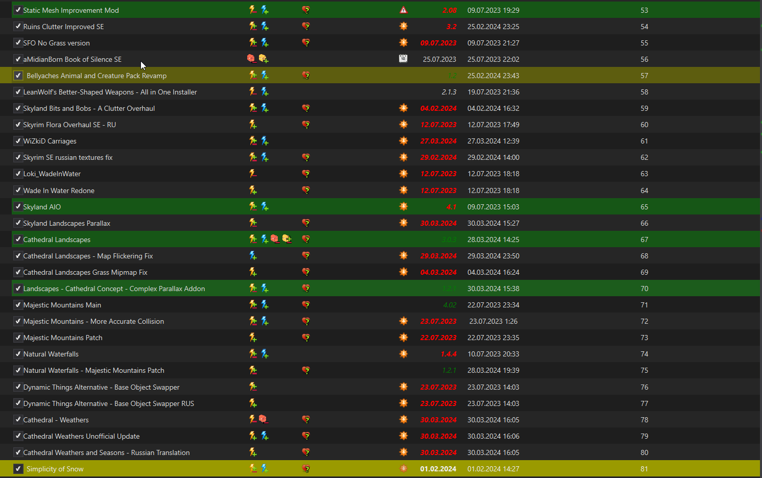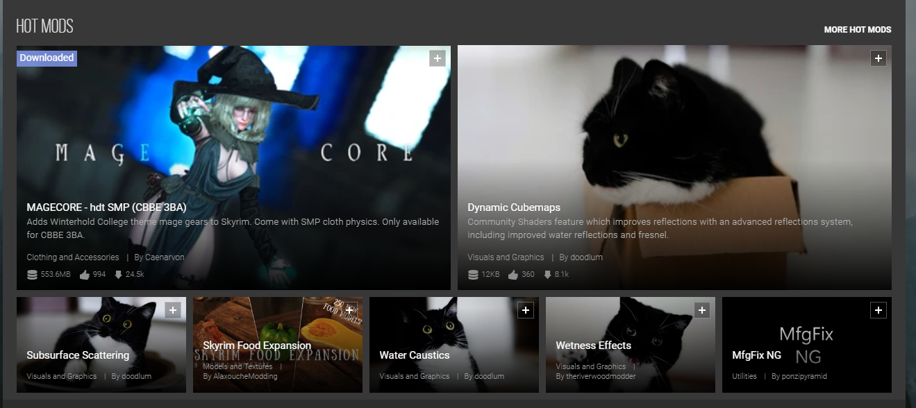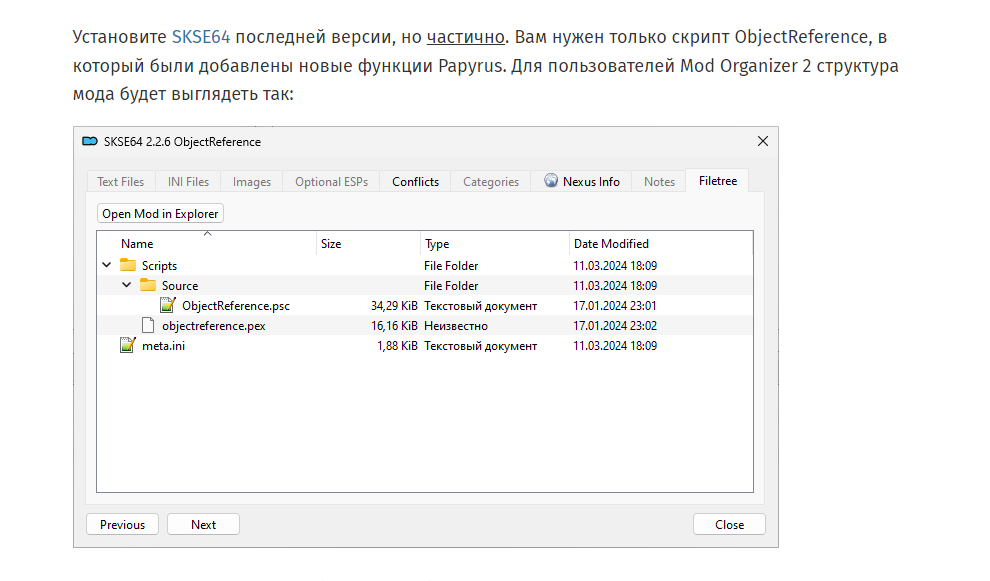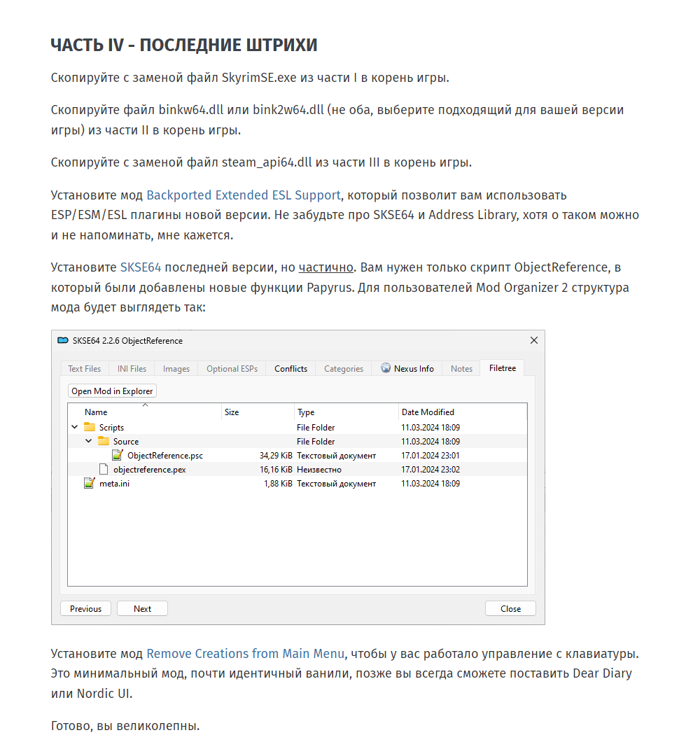 В наличии шапка с: ➔ Описанием общего порядка действий при установке модов. ➔ Зарубежными (и не только) гайдами и подборками модов от опытных допиливающих. ➔ Руководством по конвертации модов для классического Скайрима. ➔ Эксклюзивными подгонами от анонов (некоторые платные моды). https://github.com/Meridiano/SkyrimSE-Head/blob/master/01_Оглавление.md
