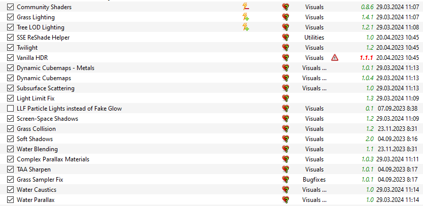 Плюсы SSE: + Быстрая загрузка даже в "тяжёлых" местах с множеством объектов. + Отсутствие микрофризов, более плавный игровой процесс. + Функции движка "из коробки" - Precipitation Occlusion, Ambient Occlusion, Image-Based Lighting и пр. + Несколько упрощённая установка (нет настройки ENBoost и некоторых других твиков). + Собственные мод-эксклюзивы, в том числе и новые механики.