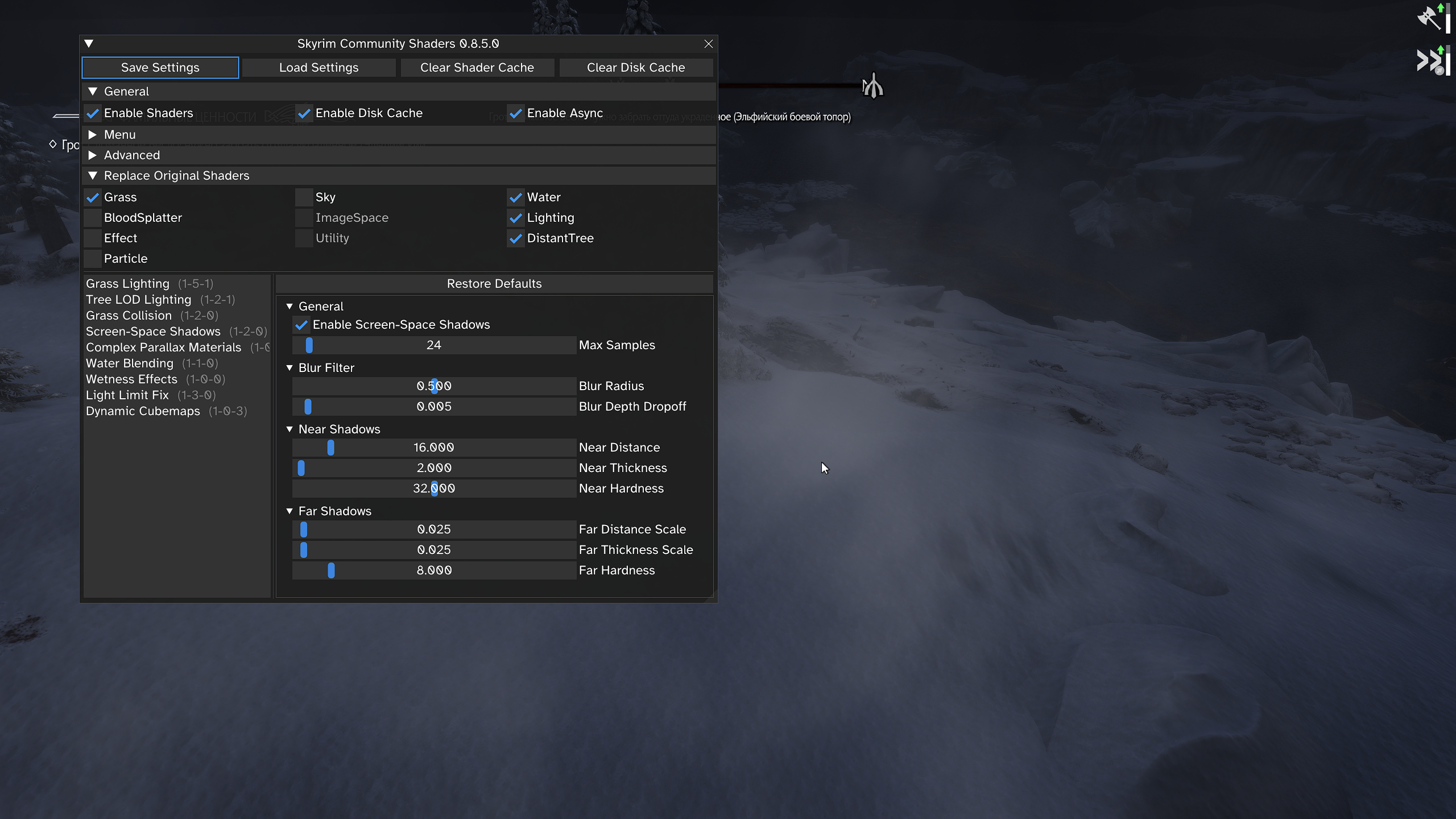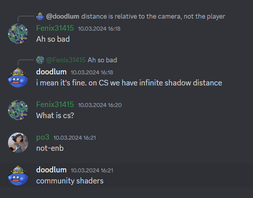 >>1955190 > Да. Проверь, есть ли мип-мапы у текстур, которые там используются. > снег имеет границу, в ночное время, которая движется с тобой Если движется вместе с камерой, то это радиус прорисовки теней, сделай побольше, граница будет подальше. Или накати Community Shaders, там есть "бесконечный" радиус прорисовки теней. Если граница движется с игроком и она довольно далеко, то это радиус применения noise-текстуры поверх lod-текстур. Решения как такового нет, только костыли, типа сделать terrain lod текстуры чуть ярче в xLODGen, чтобы noise-текстура затемняла их обратно.