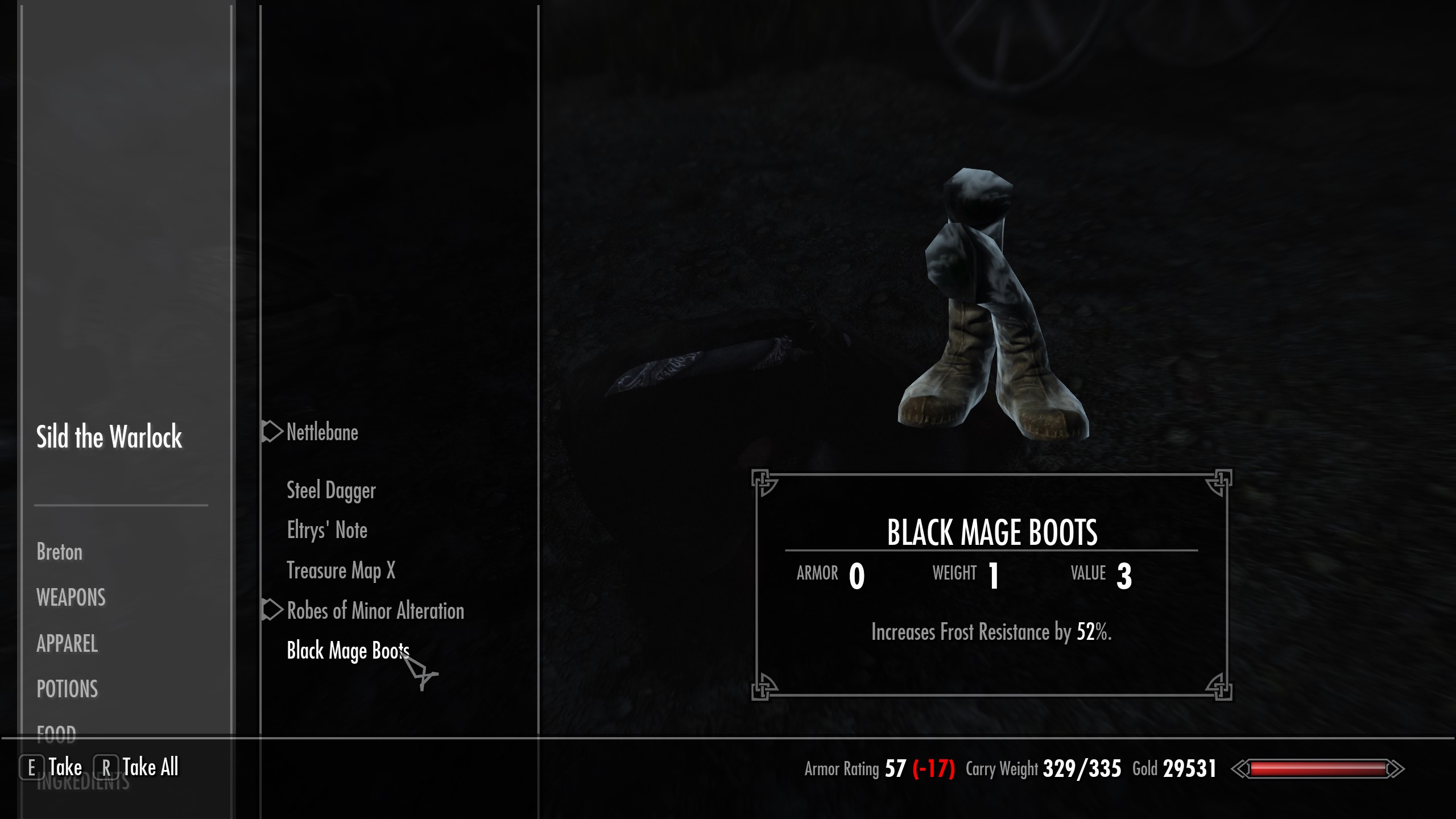 Просто положить в трупак шмотку и таким образом "одеть" трала нельзя, носят они только шмотки из своего генерируемого списка. Пришлось немного изъебнуться: уронил трала, взял тапки, апнул себе консолью чантинг до 300, зачарил на фрост резист, вернул тапки, реснул, перезашел в локу и вуаля - резист к фросту. Чантинг консолью вернул на дефолт, этот персонаж у меня алхимик и только. Минуснул себе 5000 голды, типа отыграл что купил эти тапки на заказ. Иду за Орчендором. Это вот данному анону ибо просил >>1960849 Взял Дженасу вместо Эрандура, квест делать лень, эффект тот же, щиток на +50% к огню, некля на 70%, шлем на 30% Сунул в неё стаф с фаерболом из-за перегруза, так они с Силдом на пару как артилерия работают.