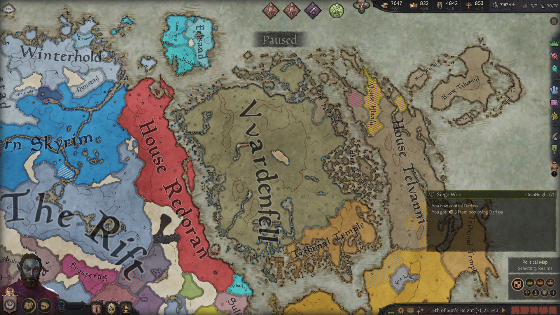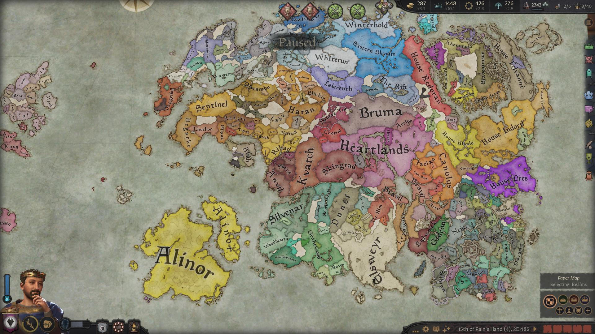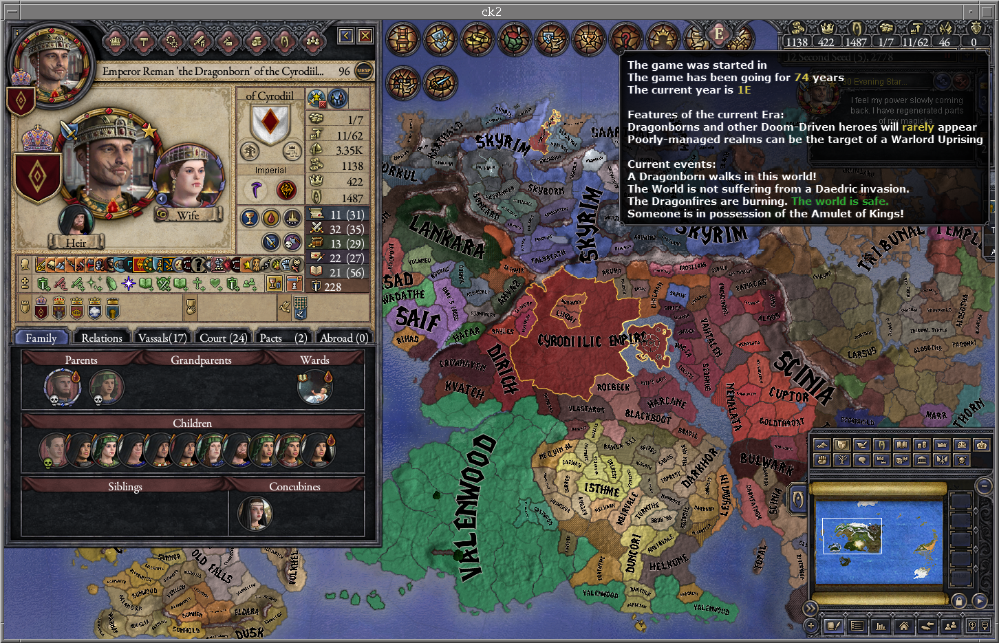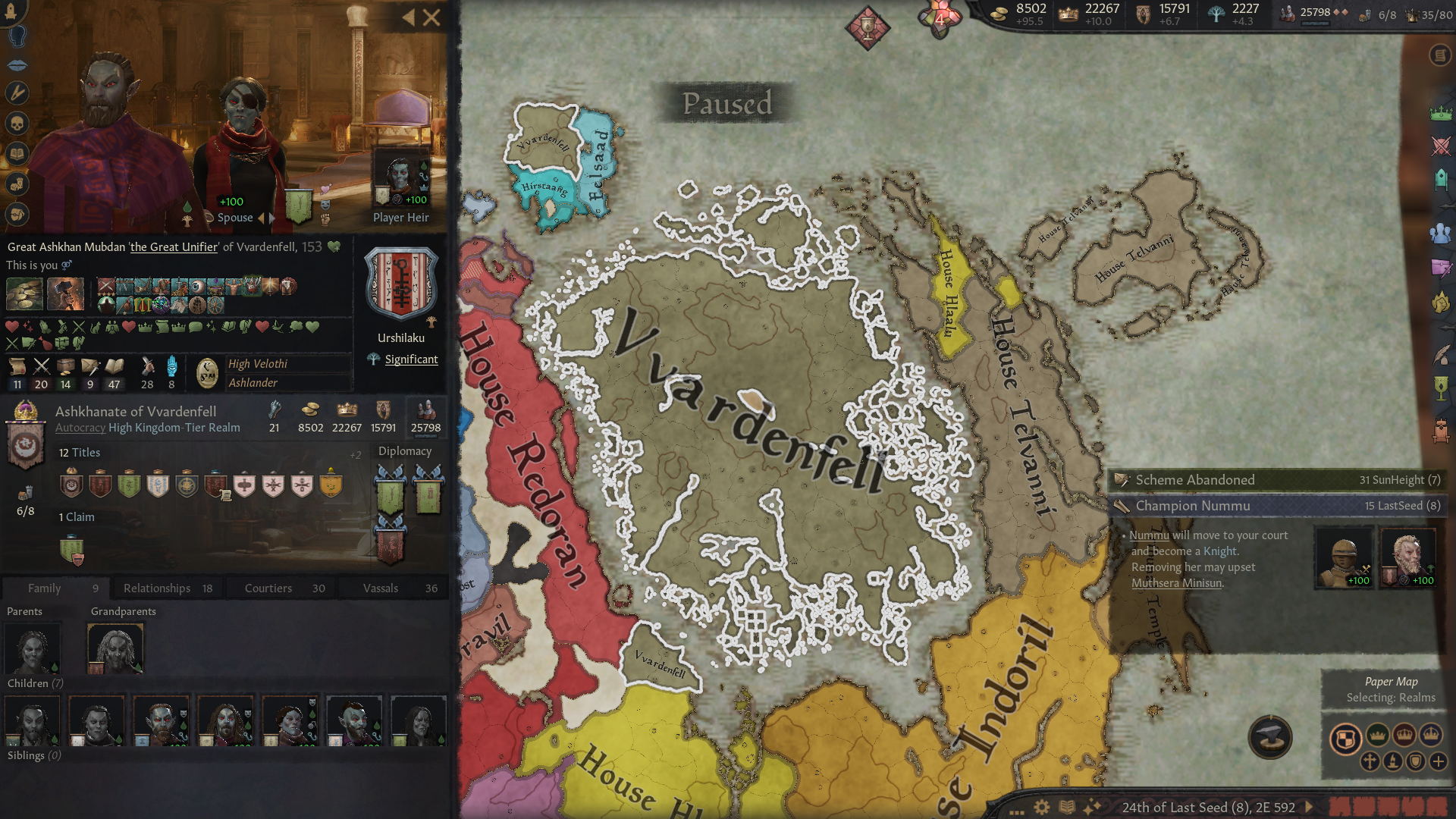 Начал за грандмастера Хлаалу, и какого-то хера к началу игры Дрес отжали кусок Нарсиса. Уже долго маячит претензия на эти земли, но все никак не могу их оформить. В данный момент Дрес воюют с погаными ящерами, поэтому объявлять им войну сейчас будет не очень скрепно, и пока что дом Хлаалу не готов пойти на такой риск (не хватает благочестия). Еще под боком один из вассалов даэдранулся, пока отношения с ним хорошие, но все равно взял его на карандаш. Еще не могу подобрать пару для грандмастера и его наследников, потому что все чуханки, понижающие престиж, а сам мастер еще и похотливый, надо же кого-то трахат. Пытался обойти закон престолонаследия, чтобы назначить наследником более способного сынка, у которого еще и дочь есть. Думал угрохать старшего, но вообще он тоже неплох, пусть пока живет. Все равно эти дунмеры живут по 300 или скока там лет.