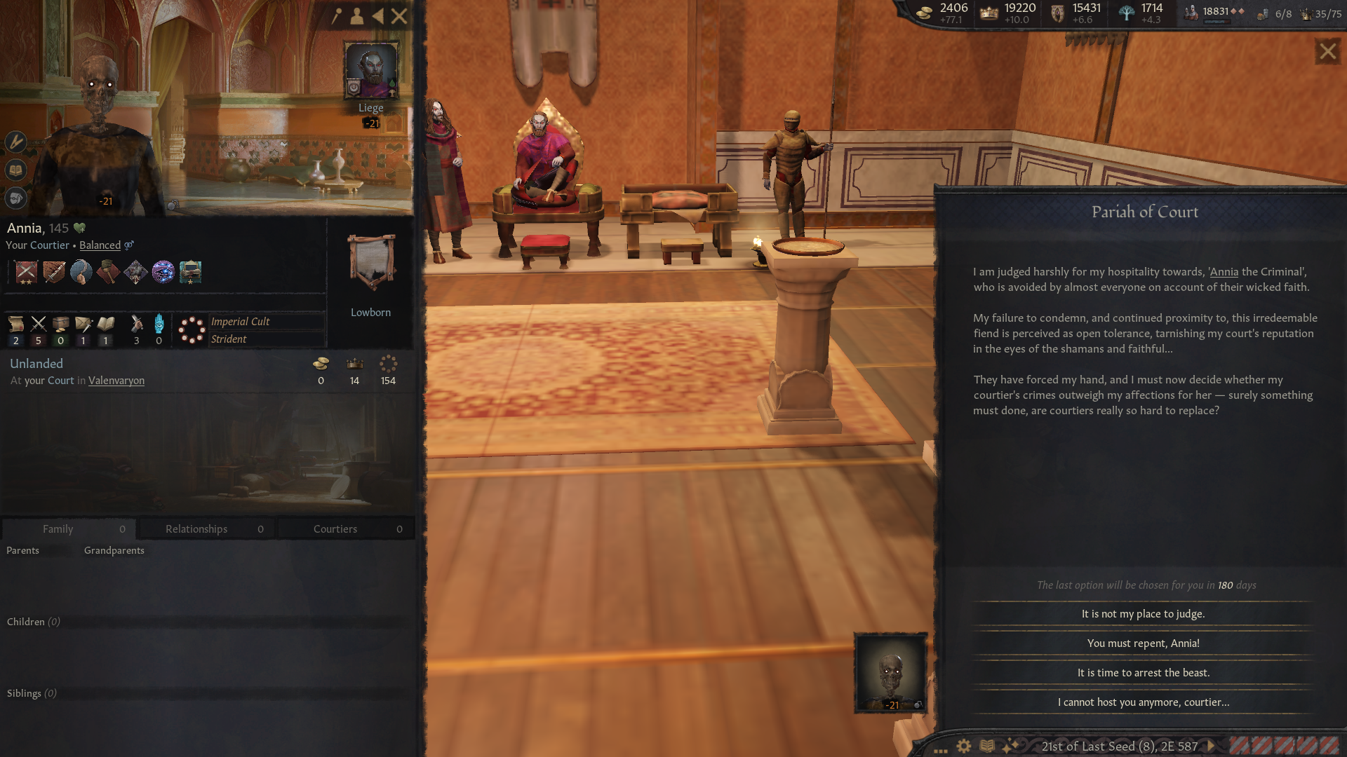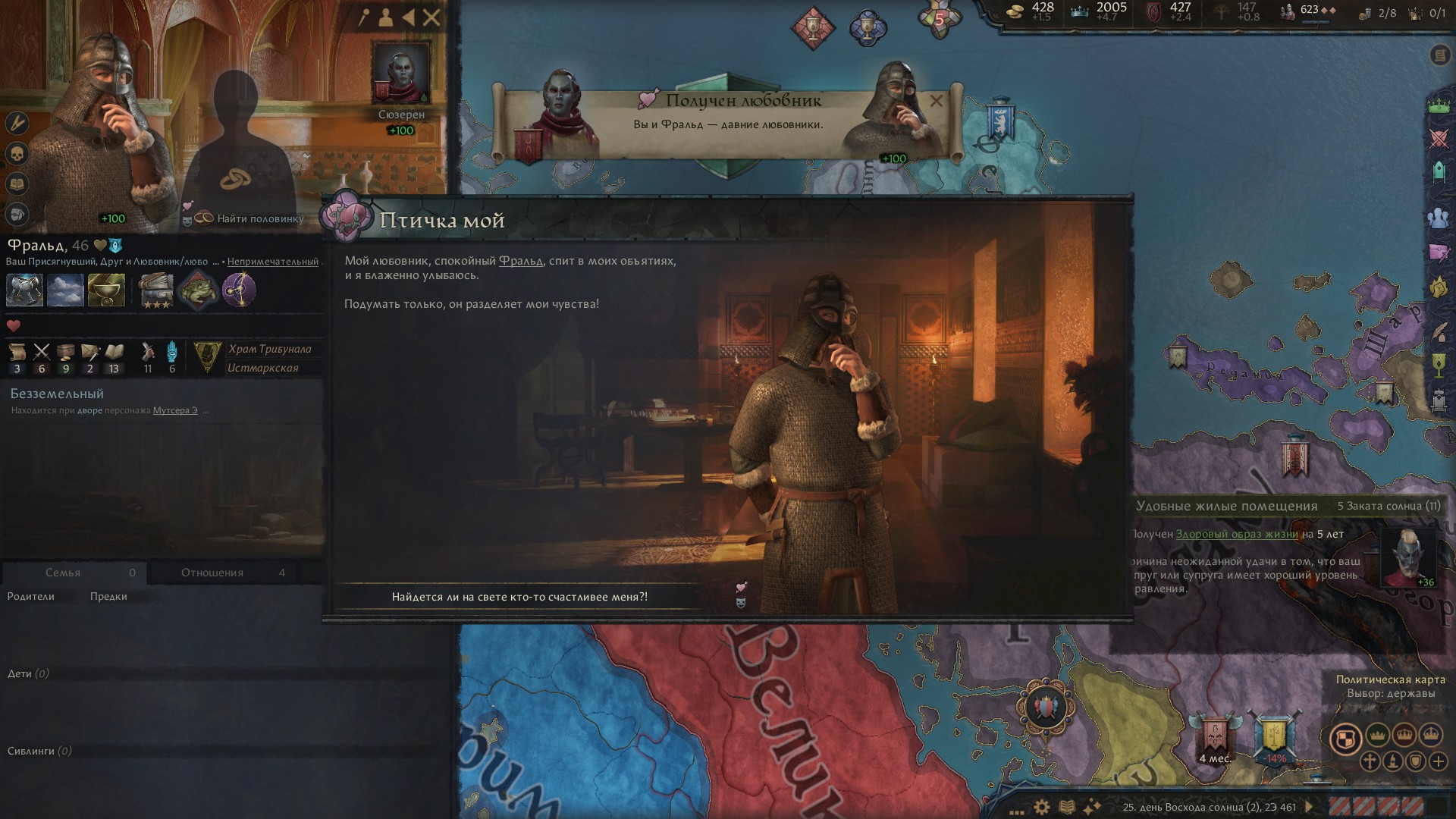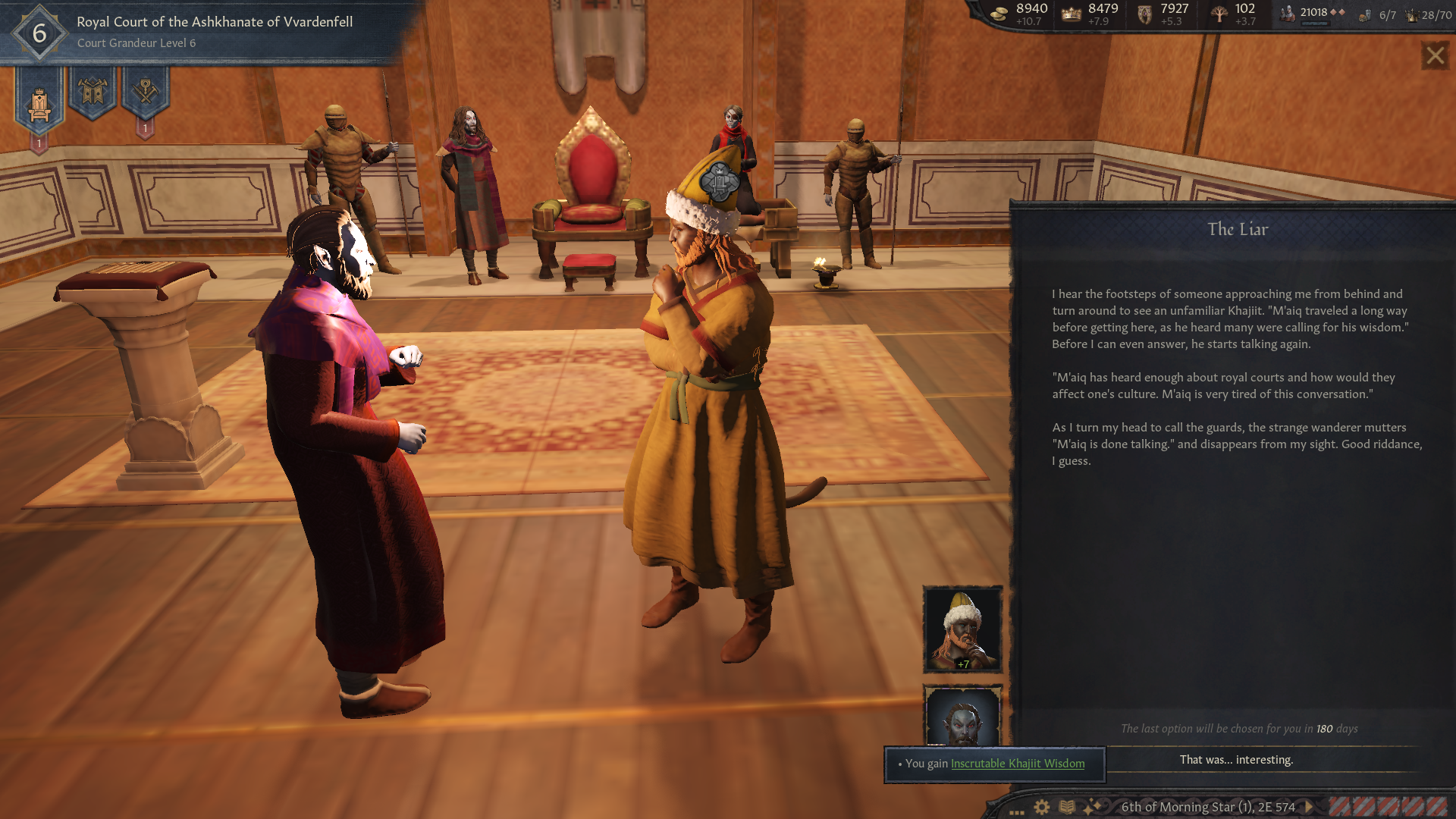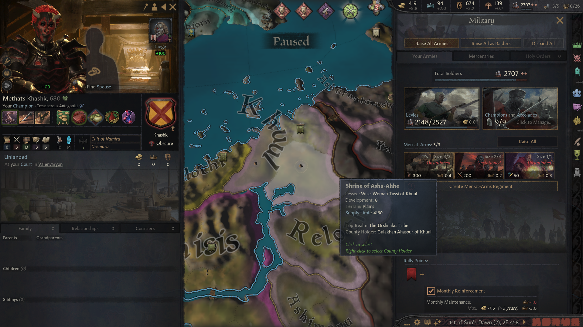 Начал за грандмастера Хлаалу, и какого-то хера к началу игры Дрес отжали кусок Нарсиса. Уже долго маячит претензия на эти земли, но все никак не могу их оформить. В данный момент Дрес воюют с погаными ящерами, поэтому объявлять им войну сейчас будет не очень скрепно, и пока что дом Хлаалу не готов пойти на такой риск (не хватает благочестия). Еще под боком один из вассалов даэдранулся, пока отношения с ним хорошие, но все равно взял его на карандаш. Еще не могу подобрать пару для грандмастера и его наследников, потому что все чуханки, понижающие престиж, а сам мастер еще и похотливый, надо же кого-то трахат. Пытался обойти закон престолонаследия, чтобы назначить наследником более способного сынка, у которого еще и дочь есть. Думал угрохать старшего, но вообще он тоже неплох, пусть пока живет. Все равно эти дунмеры живут по 300 или скока там лет.