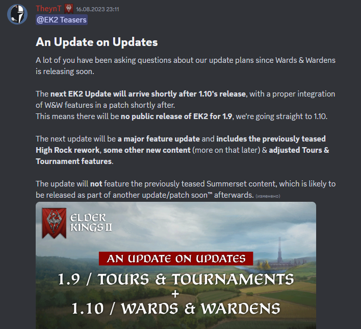 Events: 2 new pilgrimage events 2 new yearly events 2 new lifestyle events 1 new inspiration event Faith: New faith icon for Scaled Court added Added Magna-Ge secondary pantheon Added Cyrodiilic Heroes secondary pantheon Coat of Arms: CoA templates for Altmer + Balfieri variant CoA templates for Argonians CoA Templates for Ashlanders CoA templates for Bretons + Galen/Bjoule variant CoA templates for Bosmer CoA templates for Cyrodiilics (and Ojel) CoA templates for Dremora CoA templates for Dunmer, with variants depending on faith (Tribunal/Velothi/Sixth House) and Great House culture CoA templates for Goblins CoA templates for Imga, with variants depending on faith (Anui-El/Marukhati) CoA templates for Orcs CoA templates for Pirate government rulers, with cultural variants CoA templates for Redguards and Yokudans CoA templates for Tsaesci ~30 new dynastic CoA Added dynamic CoA to Skyrim when its capital is based in Bruma Added fancier CoA for Skyrim when its capital is based in Falkreath, the Rift, the Pale or Hjaalmarch Summerset Isles: New Xarxean Investiture succession law for empire tier Ceremoniarchy realms New Praxis Elective title succession law for kingdom tier Ceremonairchy realms Added the Syrabanis, Xarxesar and Phynastris dynasties, descended of the god-ancestors themselves DLC visuals: Nibenu and dead Central Nedic cultures now use Persian crowns if Legacy of Persia is installed Dwemer culture now use Persian fashion and hair/beards if Legacy of Persia is installed Yokudan culture now uses North African fashion if North African Attire is installed Some Breton cultures now use Couture of the Capets fashion is installed Dunmer, Dwemer and Chimer heritage now use Persian UI if Legacy of Persia is installed Other: New clothing for Orc cultures New armour for Kothringi and Horwalli Added back in mudcrab chitin helmets for Dunmeri travellers and lowborns, accidentally removed at one point Reachfolk now get tattoos Added the Companions as a Military Order based in Jorrvaskr New MaA illustrations for Equestrian Brigades, Armored Legionaires and Saxhleel Rel-ka Replaced DLC illustrations for Huscarls and Skaal Hunters MaA Added decisions to reveal yourself as a vampire or lycan if your faith is accepting of it * Added golden skull icon to divinity related death reasons, such as "ascended to godhood" * Added Woodland Man faith, Atmoran heritage Hermaeus Mora faith * Integrated Cultural Conversion Enhanced submod, reworking how choosing a culture to convert a province to works * Enabled converting province culture to cultures *not* of your own heritage, when Cultural Acceptance is very high * Added some new dynasty mottos * Added some new gainable nicknames * Added Accolades for mages and spellblades * The Main Menu DLC icons now explain how they apply to EK, and the EK "DLC" icon no longer shows as "Not enabled" * Pirates can use the Contract Assistance interaction if Fate of Iberia is installed * Added Lore Compendium entry for Ooze * Added new Atronach and Oblivion modifier icons, for related modifiers * Added Dwemer/Dovah letter CoA Emblems (available in CoA Designer) by rustyrobot * Added Inner Sea Specific Character & Event Background when at sea(видать не влезло)
