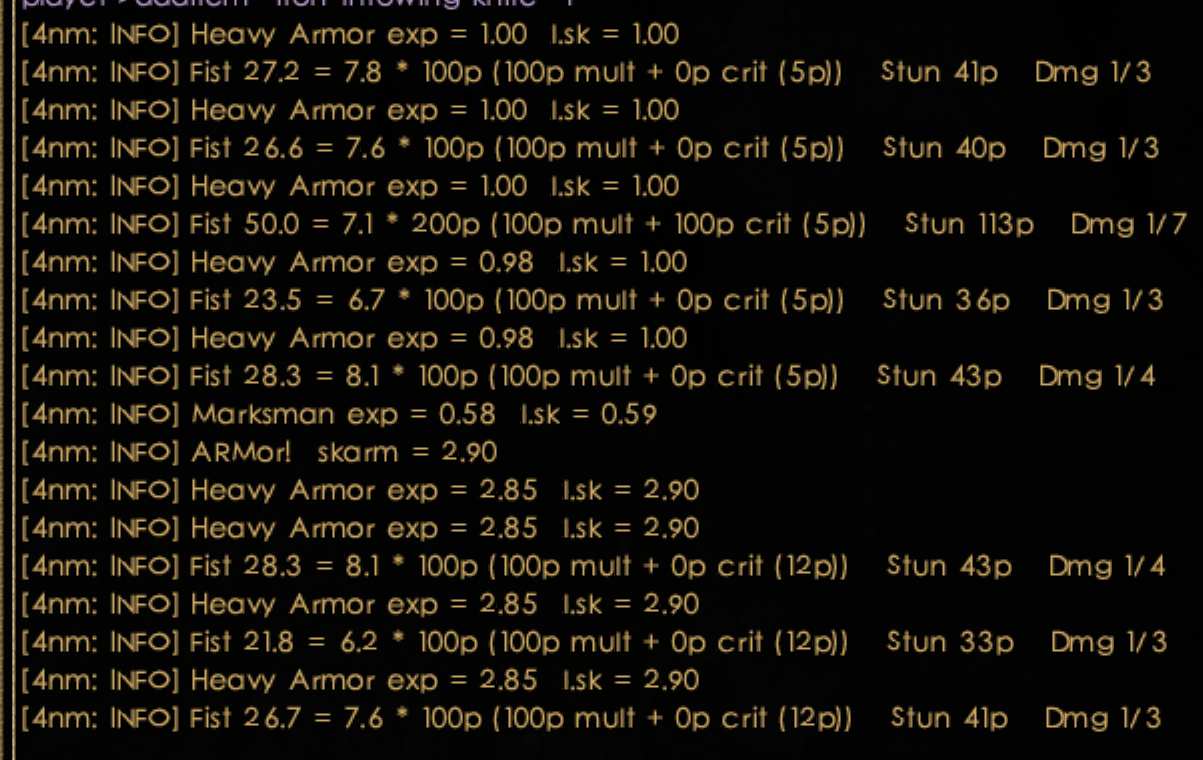 >>1998156 Первое сообщение даёт неполную инфу - оно показывает начальную скорость и не показывает бонус скилла. Второе сообщение при хите показывает инфу о скорости в момент попадания (она меняется под действием гравитации и учитывается в расчёте дамага). Но я забыл вывести бонус скила для стрел во второе сообщение. Цифра из второго сообщения = урон стрелы * (скорость/5000 + бонус скилла)
