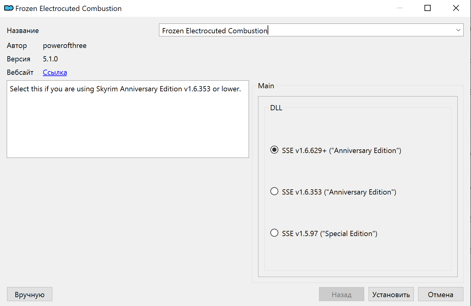 В наличии шапка с: ➔ Описанием общего порядка действий при установке модов. ➔ Зарубежными (и не только) гайдами и подборками модов от опытных допиливающих. ➔ Руководством по конвертации модов для классического Скайрима. ➔ Эксклюзивными подгонами от анонов (некоторые платные моды). https://github.com/Meridiano/SkyrimSE-Head/blob/master/01_Оглавление.md
