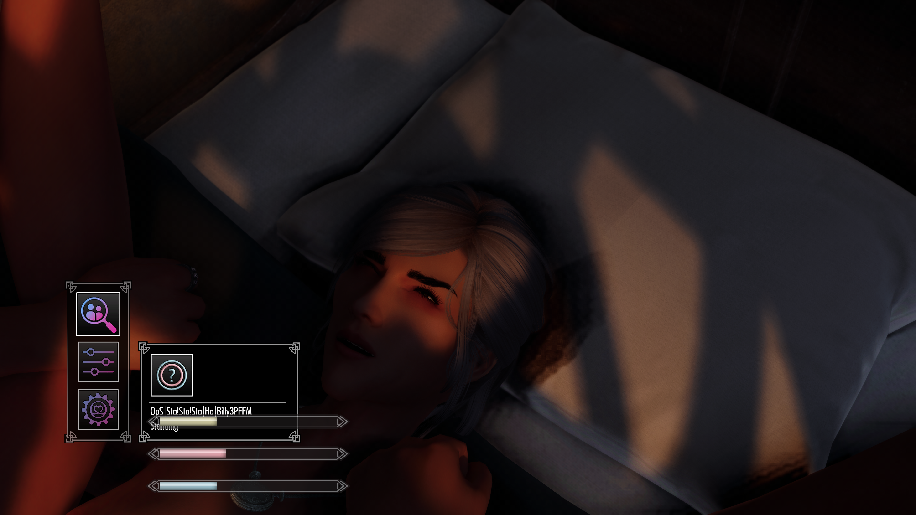 Скачал ещё ММФ-пак Billyy Threesome Animation Pack for OStim https://www.nexusmods.com/skyrimspecialedition/mods/45082 Анимации охуительные, но есть нюанс — когда мой довакин-тян зовёт развлечься двух мужиков, то один мужик занимает место в сцене для девки, а моя ГГ занимает место одного из ММ, поэтому я и какой-то Traveler трахали орка в храме Кинарет, а тот сосал отсутствующий член моего перса — смену ролей для актёров, к сожалению, в меню не нашел, а в файлах мода со сценами какая-то тарабарщина.