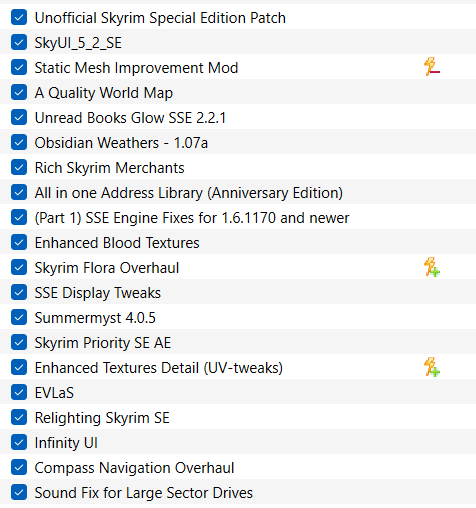Плюсы SSE: + Быстрая загрузка даже в "тяжёлых" местах с множеством объектов. + Отсутствие микрофризов, более плавный игровой процесс. + Функции движка "из коробки" - Precipitation Occlusion, Ambient Occlusion, Image-Based Lighting и пр. + Несколько упрощённая установка (нет настройки ENBoost и некоторых других твиков). + Собственные мод-эксклюзивы, в том числе и новые механики.