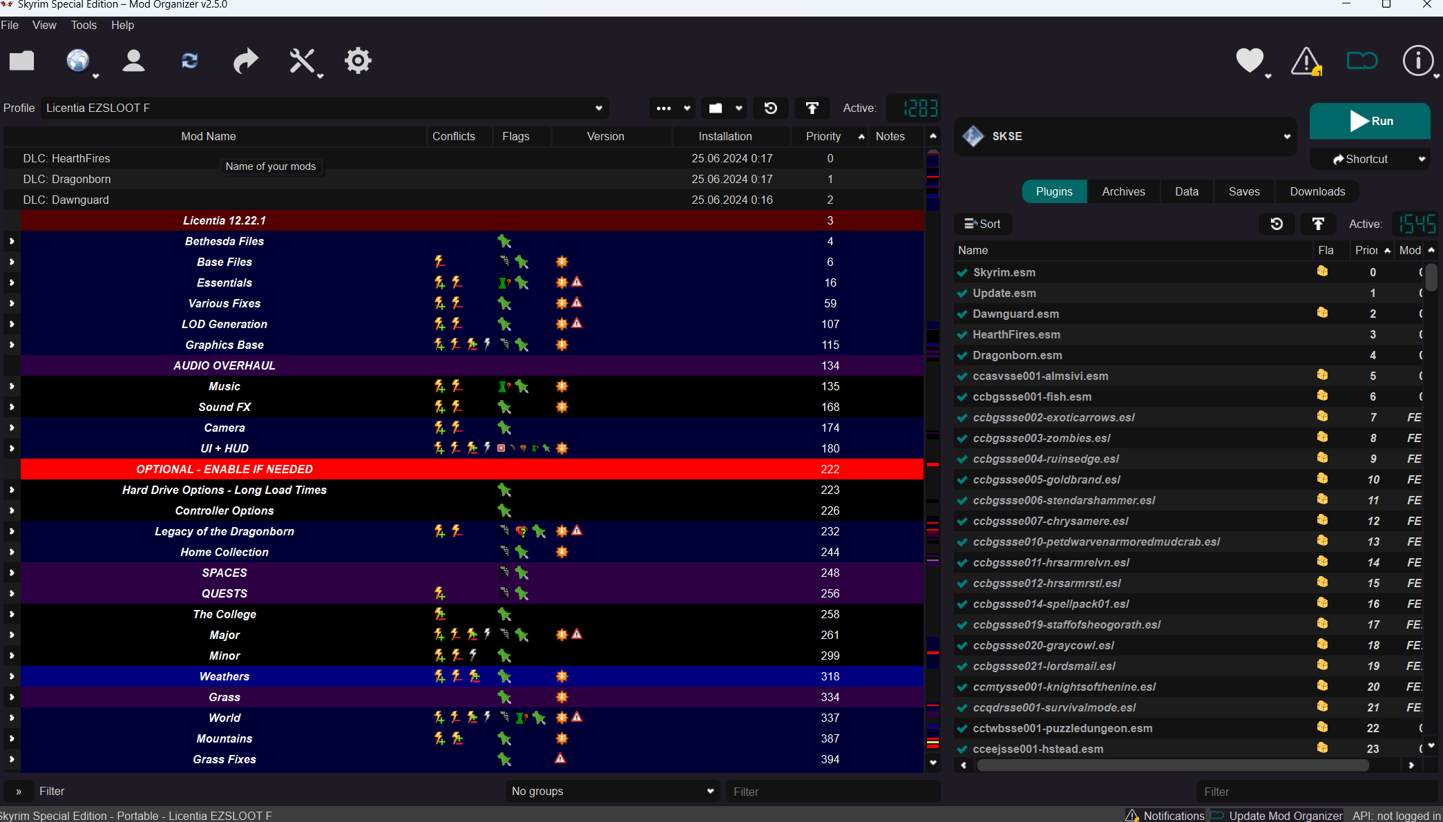 Уже лет 10 играю в Скайрим строго с модами, а с момента релиза СЕ - в него, тоже с модами. На данный момент моя сборка собственного производства, которая дополнялась все эти годы - состоит из примерно 500 модов