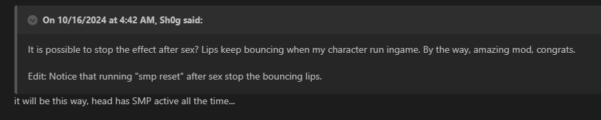 >>1977783 Ждать релиза p+ или спросить у Скраба в конфе про эту фичу, думаю он либо его подсосы точно в курсе планируемых фич. Если ждать не хочется, то довольствуйся дальше бета-тестом либо возвращайся на SL/OStim. Через год/два/три все переедем на P+ и заживем, все равно игры лучше под такой обширный моддинг не выпустят.