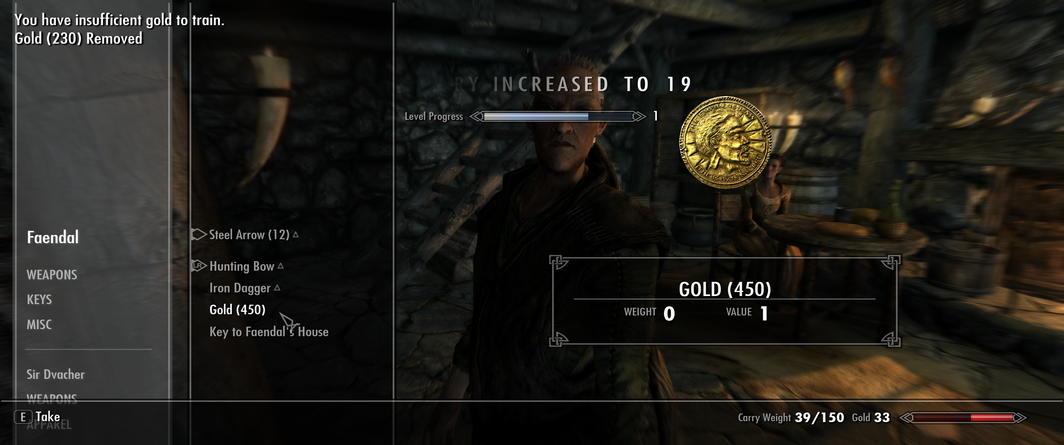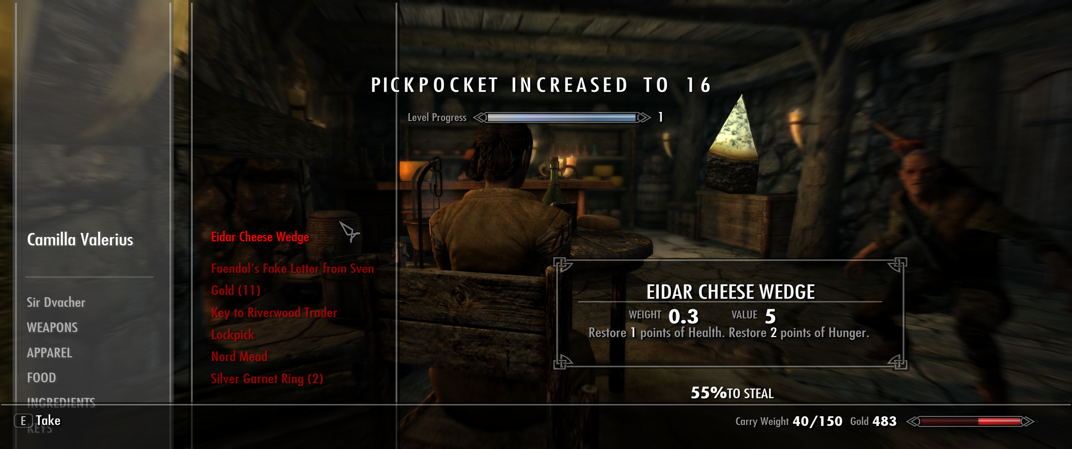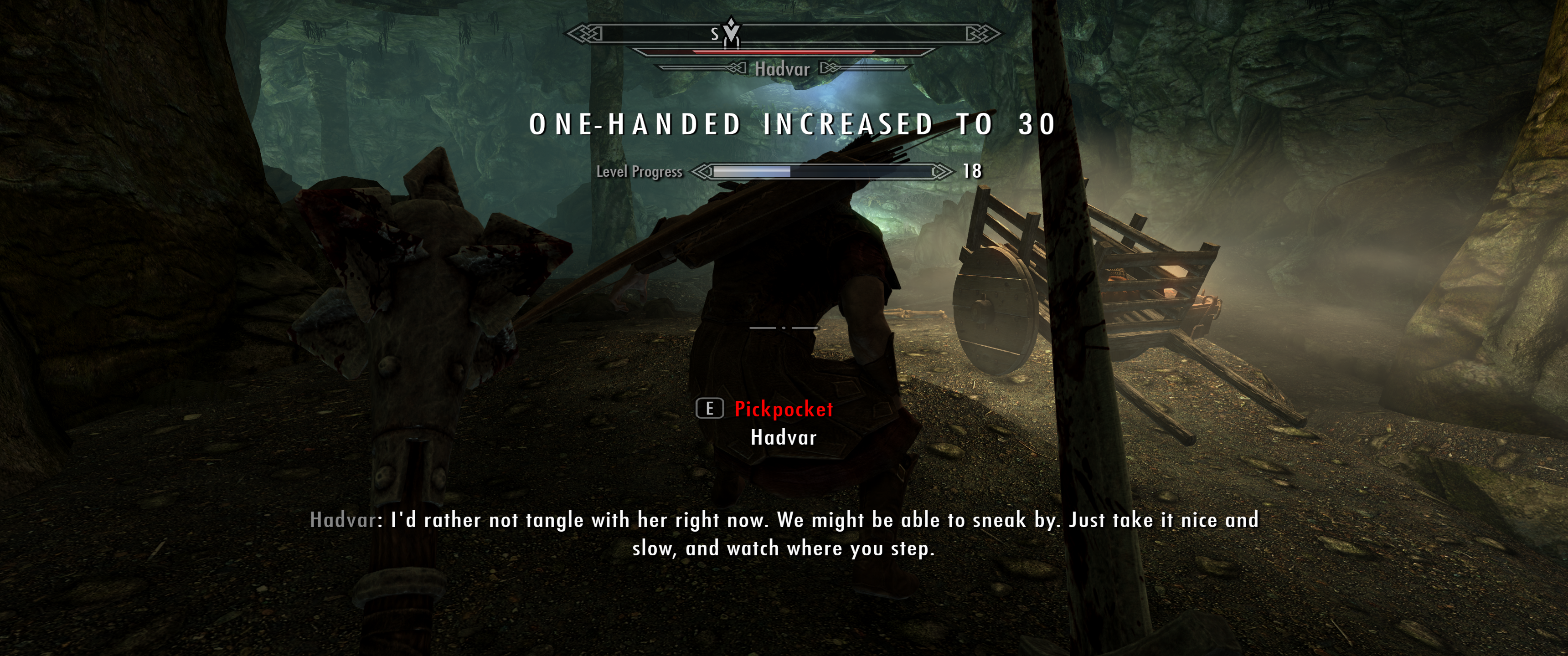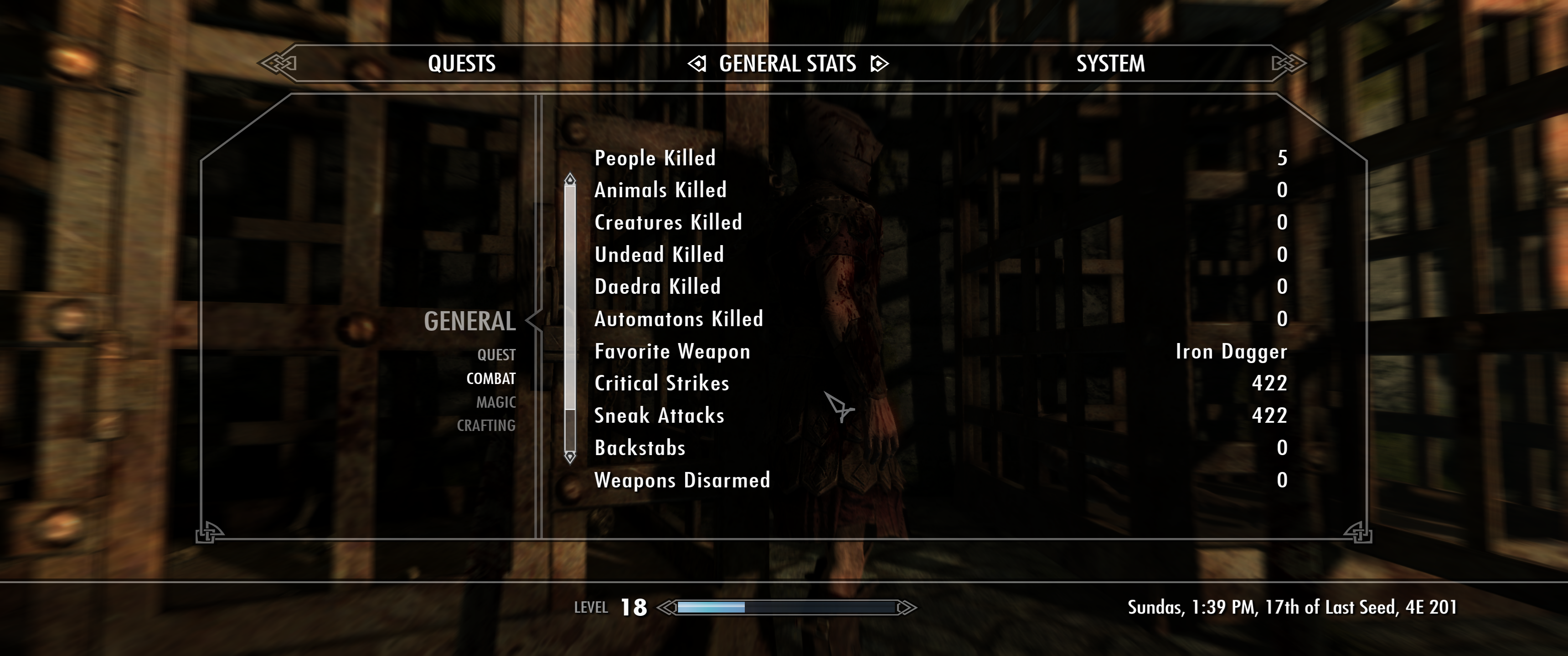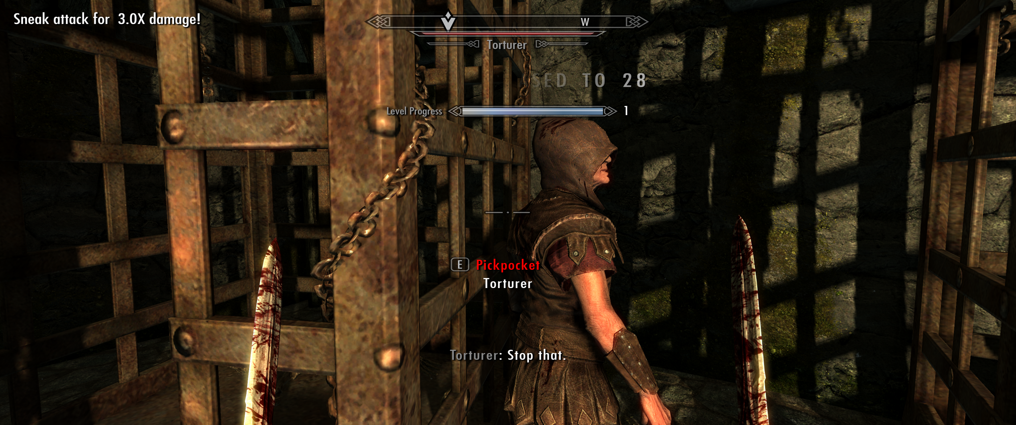 Небольшой совет, если хотите прокачать скрытность, то у вас есть 2 варианта - кинжалы или любое другое оружие. Плюс кинжалов в том, что вас после 30 лвл скрытности перестают замечать при атаках, позволяя их зацикливать, с другим оружием так не прокатит, но зато можно его прокачать до 30-40 лвл в зависимости от типа (чем больше базовый урон, тем быстрее прокачка). Я же этими эксплоитами пользоваться не хочу, поэтому откатил свой сейв.