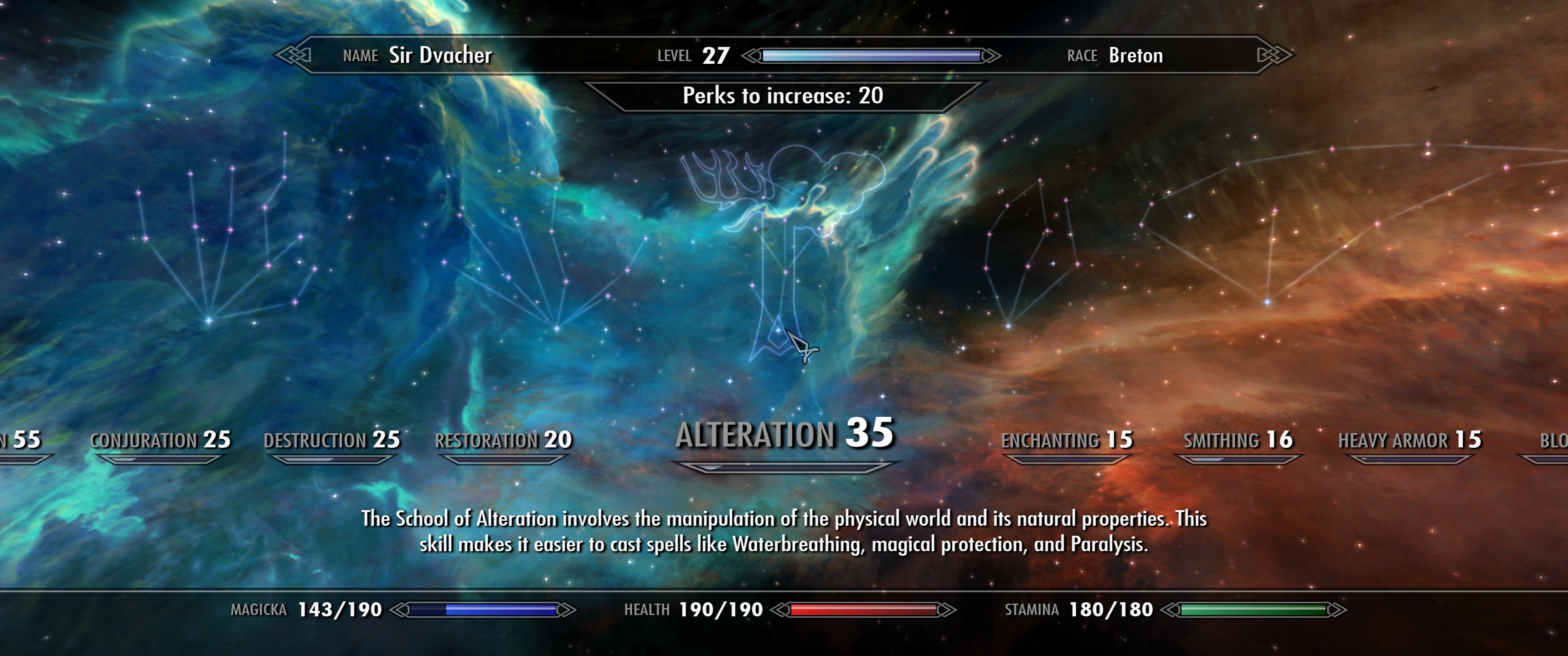 Эксплоит 3 Изменение Все помнят этот мемный способ с быстрым путешествием и телекинезом, но он требует подготовки в виде квеста Коллегии или 100% снижения стоимости. Этот же способ горазбо быстрее и дешевле - нужен mageligh и быть возле ворот Солитьюда. Кастуем спелл примерно так, как показано на 2 скрине, и за пару десятков кастов получаем 100 изменения (У меня с 20 до 35 поднялось за 1 двойной каст)