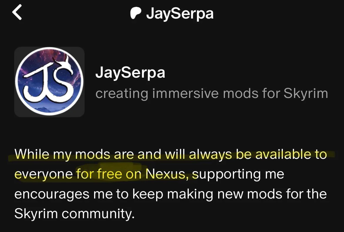 You yourself said in your last message that you are uncertain of how you’ll move forward. Which suggests that, moving forward, there is a chance all new JaySerpa mods will cost money. How many mods have you released over these 4 years? If you continue at the rate you have been over the next 4 years and I wanted to curate a mod list with all of those mods at $5 each, do you think that’s fair on the user end? At $5/ea if you make 15 more mods that’s close to the cost of a brand new AAA title, do you think 15 of your mods are worth a AAA title? You’ve made close to 100 mods on nexus if you make 100 more mods at $5 a piece that’s $500 on the users end, how is that helping the community when we gate keep shit like that? So you can only play high quality modded Skyrim if you’ve got $1000 to spend on a good mod list?