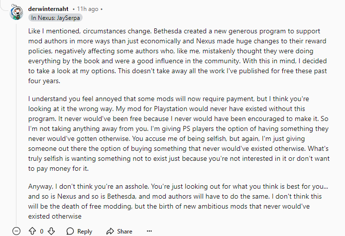 So unless you can tell me that BGS is giving you over 80% of the profit (better if it’s 100%) and you can convince me that it’s actually a good thing that people will eventually have to pay hundreds of dollars to get a quality mod list in the future. (Which you can’t convince me of) then we’re just on opposite sides of this because I’m not thinking about myself. I make mods, I’ve got a few up for Xbox players, a few up on Nexus and I make plenty for personal use, I also support mod authors where I can, I’ve spent hundreds of dollars supporting mod authors across Patreon and Kofi because I know mod authors deserve to get something for their work, so I’m someone who can afford to pay for mods. However not everyone can and those are the people in the community that I’m arguing for. I also can’t stomach the argument “There will always be free mods, it will never be all paid mods” because that’s so aggressively against the point especially coming from the mod authors who made quality free mods and are switching to being a paid mods creator? Like you’re basically saying “ other people … not me though “ which like, eventually if everyone else is doing it with that mentality you’d be stupid to not be doing it yourself. This platform also dissuades people from making mods like Xedit or mods with assets for other people to use because they can’t be put up for sale and if everyone else is selling mods, why bother making things no one can use or making things you can’t sell?