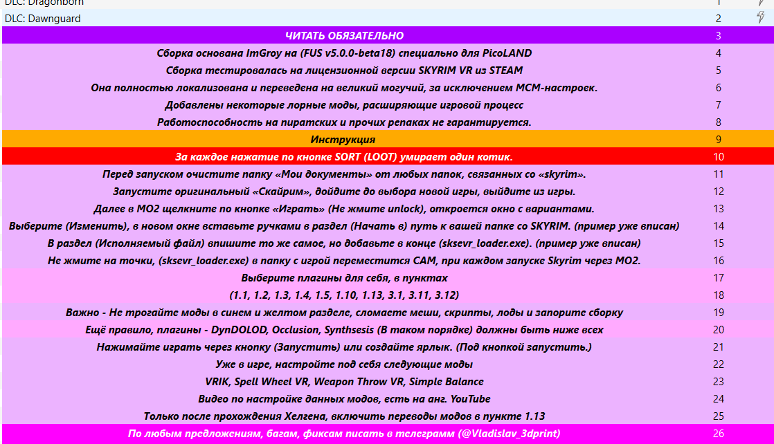 В наличии шапка с: ➔ Описанием общего порядка действий при установке модов. ➔ Зарубежными (и не только) гайдами и подборками модов от опытных допиливающих. ➔ Руководством по конвертации модов для классического Скайрима. ➔ Руководством по даунгрейду игры с сохранением нового контента. ➔ Эксклюзивными подгонами от анонов (некоторые платные моды). https://github.com/Meridiano/SkyrimSE-Head/blob/master/01_Оглавление.md