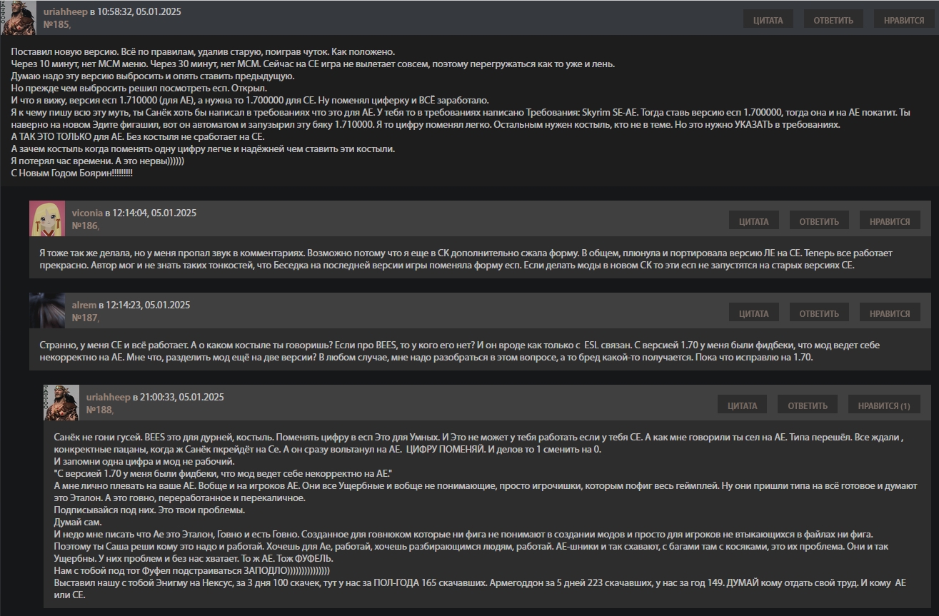 Особенности SSE: ➔ Самые популярные версии игры - 1.5.97, 1.6.640 и 1.6.1170 (Steam). ➔ Некоторые моды, связанные с SKSE, поддерживают не все версии игры. ➔ Skyrim Upscaler (есть в общей папке) и Lossless Scaling полезны как никогда. ➔ Война между проверенными старыми и перспективными новыми решениями нескончаема.