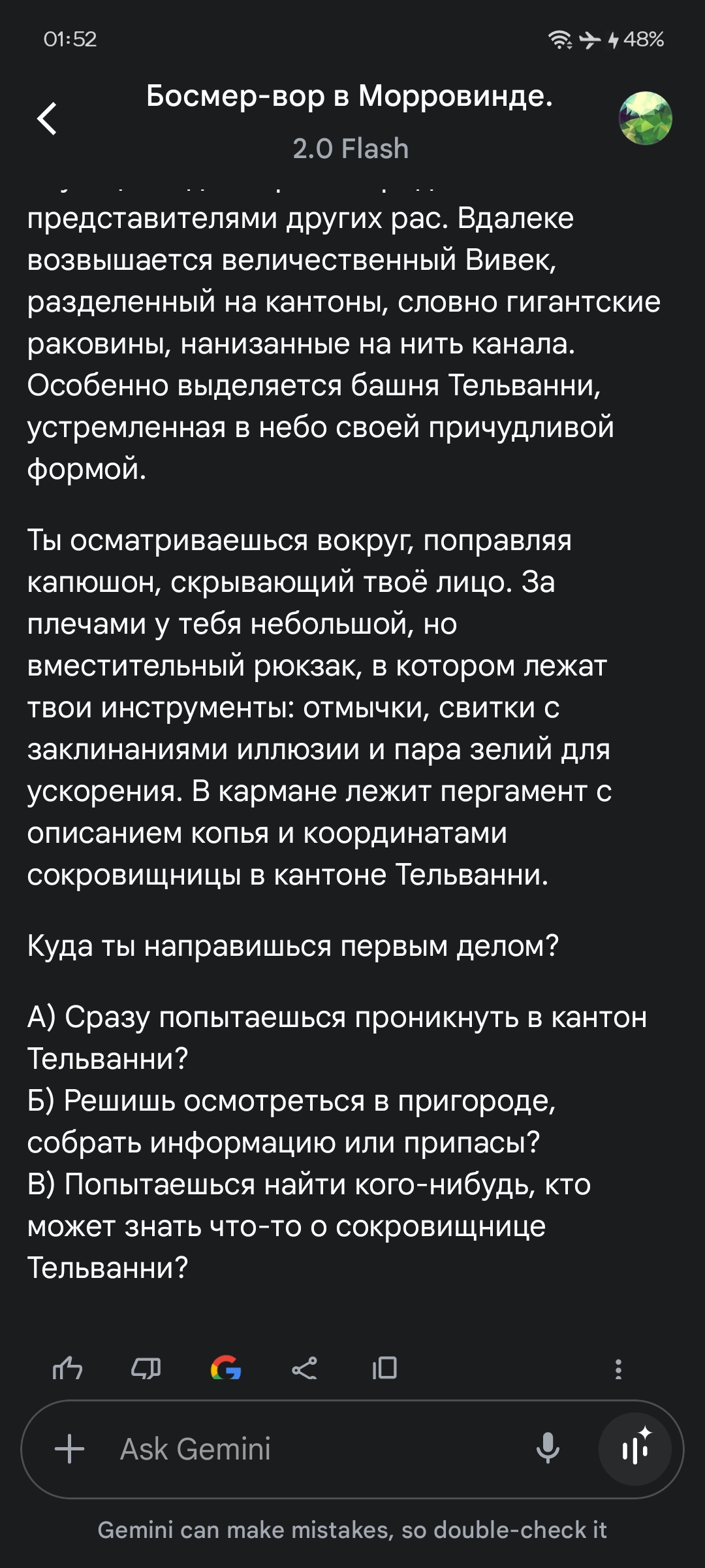 Забей. Тебе нужно в Вивек. Ты должен совершить великое паломничество - само себя оно не совершит. Ты станешь патриархом вся Моровинда. Паломничество многому научит тебя, и, вернувшись из него, ты будешь совсем другим. Прочти о паломничестве. У него много условий. Одно из них - ходить ПЕШКОМ. Многие места требуют подношений. И да, свечи, купленные вне храма, прости, зелья, сваренные самостоятельно, в качестве подношений не годятся. Дерзай. После паломничества ты многое поймешь, и я бы советовал отправиться тебе на солтсхейм, попутно вступив в легивон. Там ты сможешь отыгрывать имперского колонизатора-вояку, мотаясь между бюрократами и первопроходцами. Дерзай. Потом три великих дома: Тельвани, Редоран и Хлаалу втянут тебя в свои разборки и дадут построить свою крепость. В конце. Самом. Потом ты какбе спросишь: "Что дальше?". Я скажу тебе, что на дне Вивека, под ареной, есть место, Место, я бы даже сказал. Там Мефала будет говорить с тобой, это великая честь, как ты уже догадался. Мораг Тонг заявит на тебя свои права, и ты пройдешь долгий путь от раба до грандмастера. Ты справишься и многих убьешь, но таков путь. Можешь не убивать, а стать шестеркой гильдии воров. Они тут недавно. Хабаси в туманной Балморе покажет тебе что да как. Есть гильдия воинов и магов, но они чужды этому миру, Чужды этому острову. Ты сам поймешь. Ты сразишься с Гирцыном на севере и победишь. Сразишься с шестым домом, и тем, кому, снится его жизнь, и опять победишь. Пепельные шторма пройдут и барьер падет. Потом ты отправишься в Морхольм и убьешь Бога. И что важнее - убьешь самого везучего босмера в мире. В локализации от 1с писатель при дворе Хелеста Хлаалу скажет эпическую фразу, от которой у меня наворачиваются слезы на глаза: "Рад видеть тебя опять, друг! Я тут пишу понемногу." А один из Её Рук скажет: "Ты её новый пес?". Ты станешь оборотнем, а твой меч будет разгонять мрак самых темных подземелий и пылать как Истинное Пламя. Тебя втянут в разборки вампиров. Помни: Куара не забагованы. Ты встретишь Тель Фира, и найдешь тайник Фаргота. ты нашлешь на Морхольм пепельные бури. Ты найдешь Лжеца. Ты победишь Гренделя, что спит возле Медовых Залов. Ты вернешь украденное Солнце. Ты обгонишь Пловца. В пеньке ты найдешь Ложь, Обман и Смерть 3 или 6 штук. Тебе выкуют латы изо льда, или адамантина, или ты соберешь их. Рьикленги будут без ума от тебя. Скальные наездники тоже. Ты найдешь корабль, что потерпел крушение, но который ни разу не касался воды. Ты сможешь нести Слово Девяти, но как его нести тем, чьи боги живы и ходят среди смертных? Даэдрического арбалета нет! Враги из Темного Братства не дремлют! Скумма - это неплохо. Но нужно больше бренди. "Квада Настра Вадис!" не переводится. Маску Клавиуса Вайла найдешь в руинах на севере острова, где все время дуют моровые ветры. Эшлендером рождаются, но иногда становятся. Дерзай. Гуары милые. Стеклянный шлем похож на корону Саурона. Говорят, кто-то в канализациях Вивека убивает ординаторов. Говорят, шестой дом пробудился. Говорят, в церкви раскол. Говорят, в Империи неспокойно. Говорят, луна-и-звезда убьет Ненеревара. Говорят, что Нереварина убил завистливый Трибунал. Говорят, что если не будет героя, то не будет и подвига.