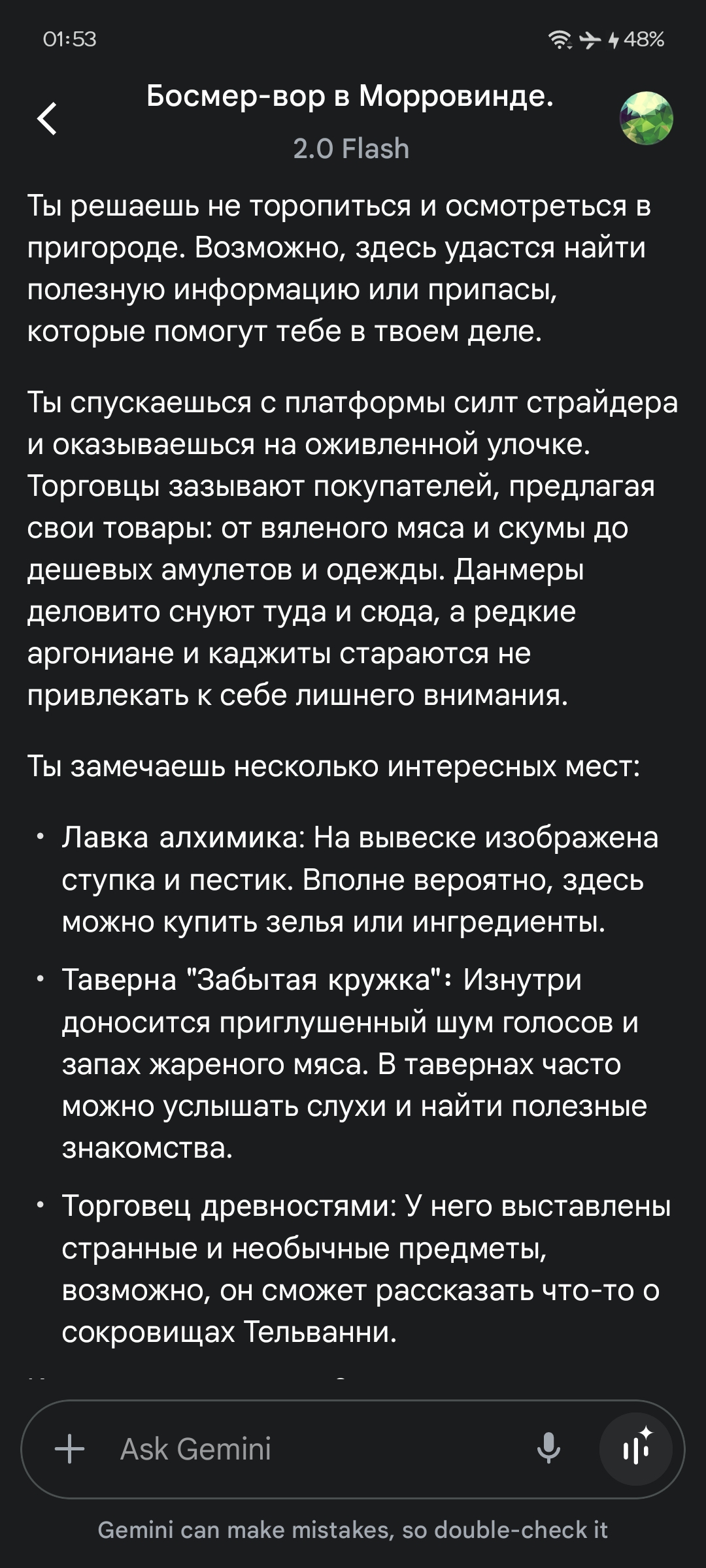 >>1993464 По разному. Если посмотреть на карту, то можно увидеть, что рядом с некоторыми даже большими поселениями нет никаких источников воды. А это значит в каком-нибудь Альд'руне они могут месяцами не мыться. А вот в Найсисе (никакой он нахуй не Гнисис) можно купаться в речке, что и делал тот данмер, у которого украли штаны. С другой стороны Телванни славятся своими духами из жучиного мускуса, которые вроде как очень приятно пахнут. Но и позволить себе такую роскошь могут не все. Еще если речь о данмерках, то они будут пахнуть специфической местной едой и выпивкой - суджаммой, скаттлом и т.д. Ну и в большинстве районов кроме запаха вулканической серы и пепла ты мало что почувствуешь