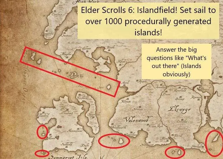 Все дороги ведут на запад... 2 провинции Хай-Рок и Хаммерфелл Предпологаемый сюжет: прорыв дракона вызванный Двемерами. Предпологаемое название- TES 6: Breakdown Так же существуют неподтверждённые сливы о размере игрового мира в количестве 12 городов и морских путешествиях.