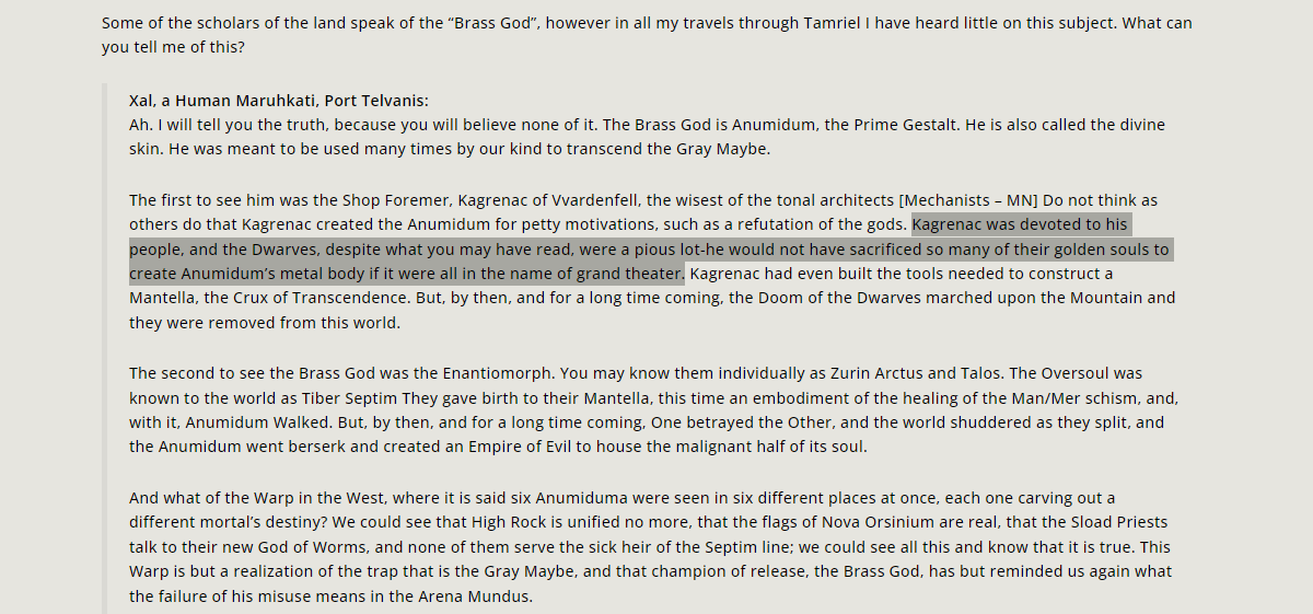 >По сюжету. Будет что-то типа линейки квестов для простых игроков и линейку для энтузиастов, которые рано или поздно выйдут на настоящий мейнквест. Он вроде будет основываться на том, что доминион терпит поражение, но идет ва-банк, он хочет уничтожить последнюю башню. Но прикол в том, что башне Диренни похер на все, т.к. на самом деле она не последняя башня, а последняя башня/и закручена/ы в тайми-вайми и еще не построена. Леворукие эльфы, для которых время идет и ощущается наоборот, появляются в Хаммерфеле. Они хотят построить новую орихалковую башню, но вот незадача, у них нет камня. А камнем башни является меч, то есть Шехай, с которым внезапно появляется ГГ и появляется возможность вновь активировать башню. Эмиль, ты? >К тому же в орки ищут по всему заливу части Нумидиума и ходят восстановить медную башню. Единственное, неизвестно, как питать нумика. Либо будет какой-нибудь прикол с Талосом, либо найдут очередную вундервафлю двемеров. Нкмика питали во второй части и питали его клона в третьей части. Делать три раза сюжет вокруг нумидиума бред
