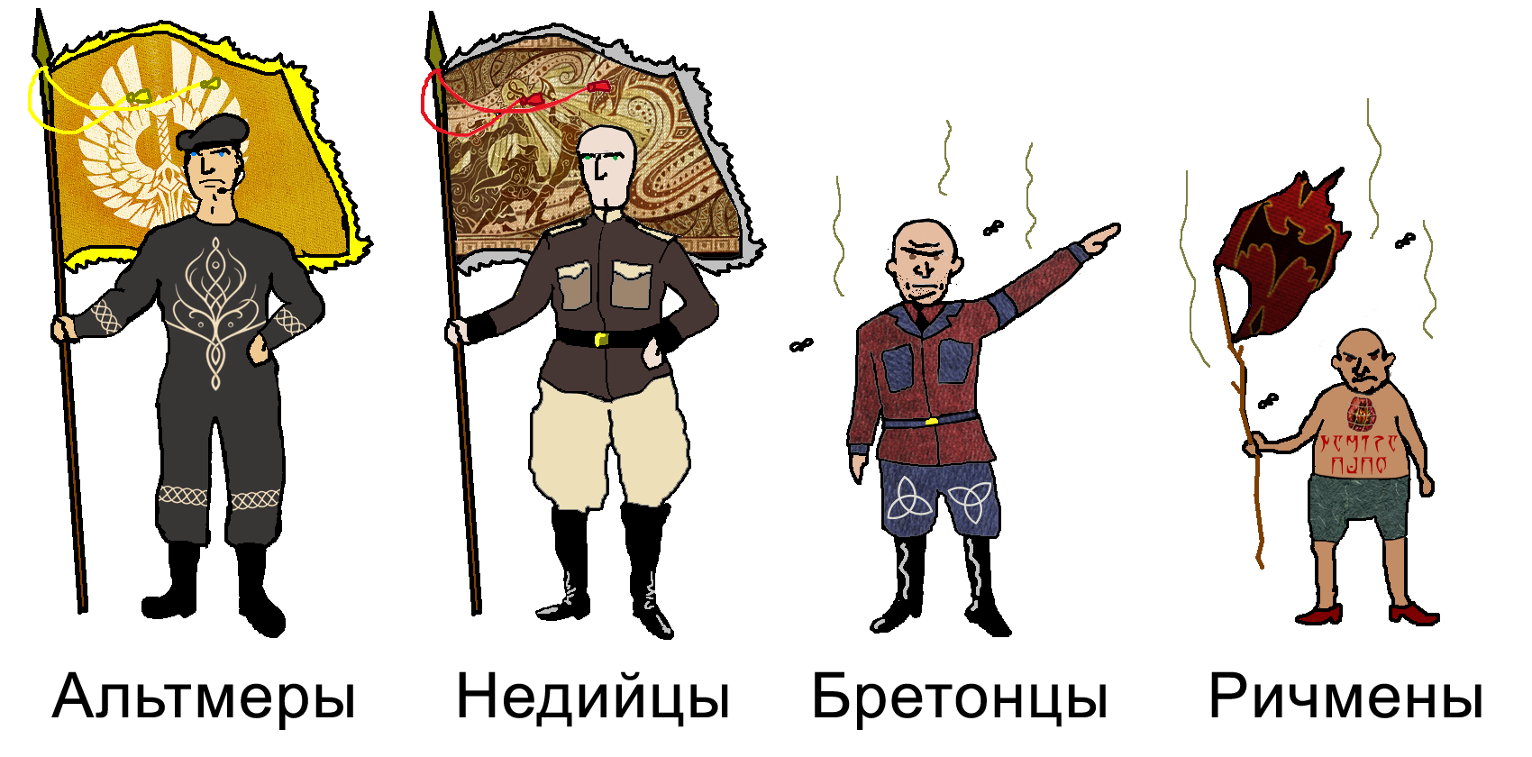 >>1994486 Разноцветных редгардов. Более знатные - более темные (их мало), большинство белые редгарды - простой люд, бандиты, кочевники. Может пираты которые служат знати, тоже белыми редгардами будут (в меру как испанцы). Остальные расы по минимуму