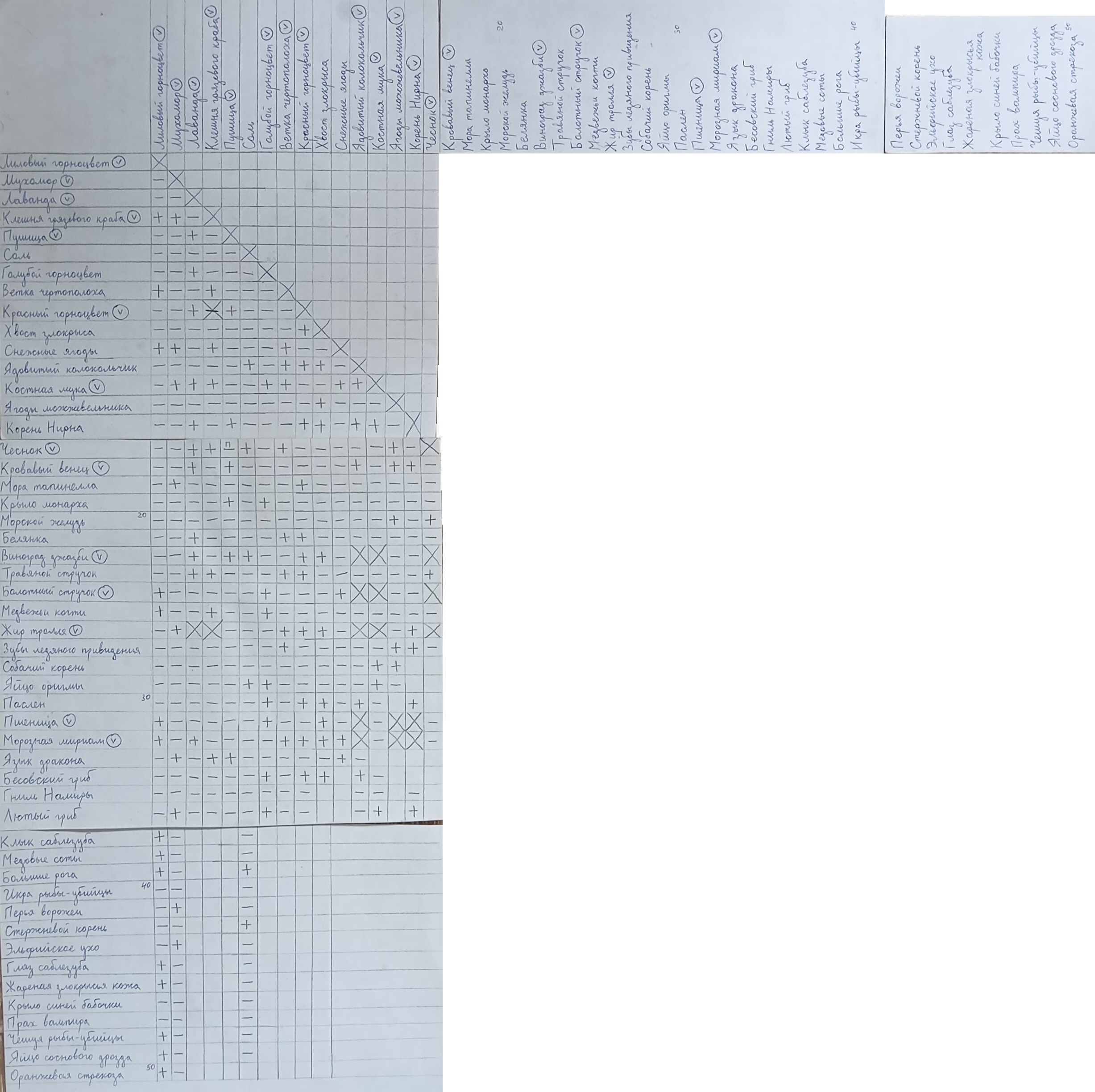 >>2013669 Дополнение: ингредиентов с полностью открытыми свойствами больше, я их в таблице помечал галочкой в кружочке. По верхнему ряду заполнял везде, а слева только там, где еще остаются возможности для экспериментов.