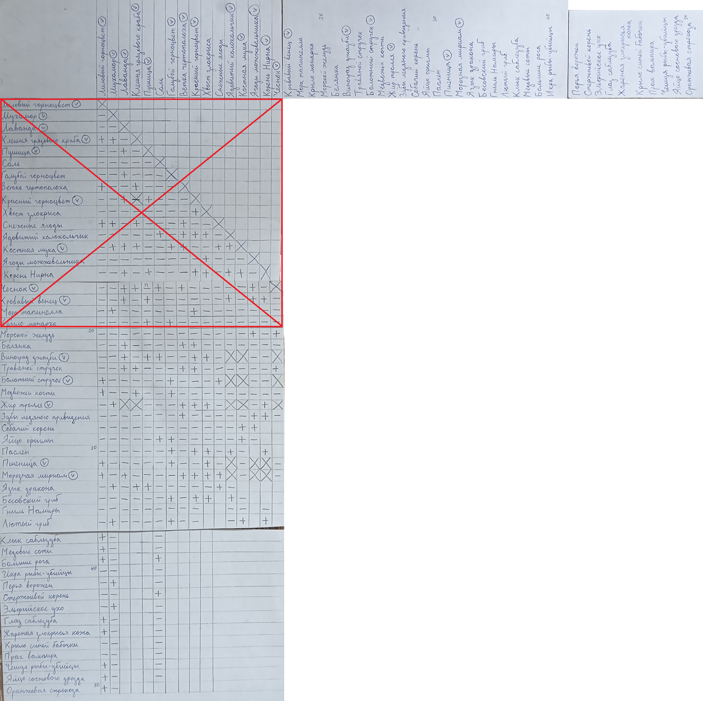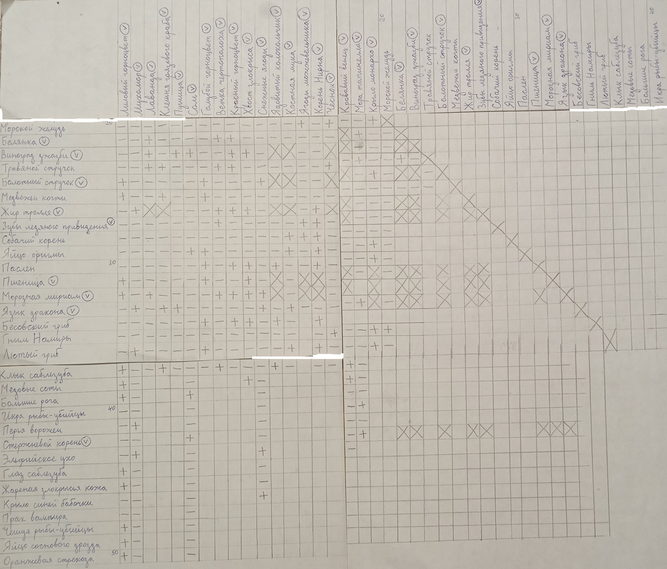 Устроил разбор сундука в своей алхимической лаборатории. Выписал матрицу для 10 самых больших по количеству у меня (либо полно в руинах вроде костной муки, либо растет вдоль дорог). В ходе проведенных экспериментов полностью раскрыл все свойства клешни грязевого краба, красного горноцвета и лаванды. По 3 свойства изучено у корня Нирна, костной муки и чеснока.