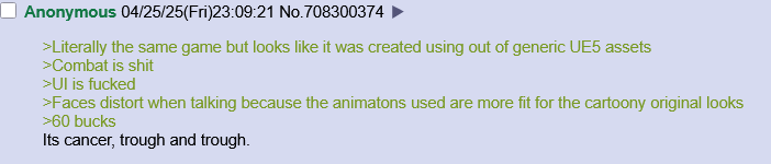 >>2004270 Правда потом окажется что кроме накрученного травона и перешарпленных текстур и нет нихуя, всё те же дерганные анимации из-за древнего движка, деревянная физика и необходимость пердолинга буквально каждого аспекта там где в ремастере всё искаропки.