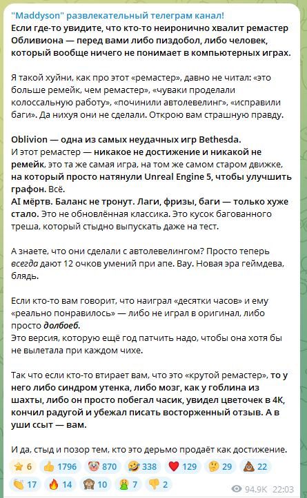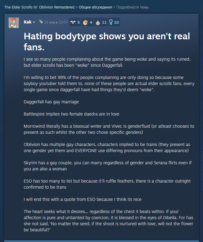 Как ты из моего поста где я восторгаюсь музыкой обливиона высрал связь с каким-то своим протыком из тесо-треда который еще и поливал облу говном? Ты шиз?