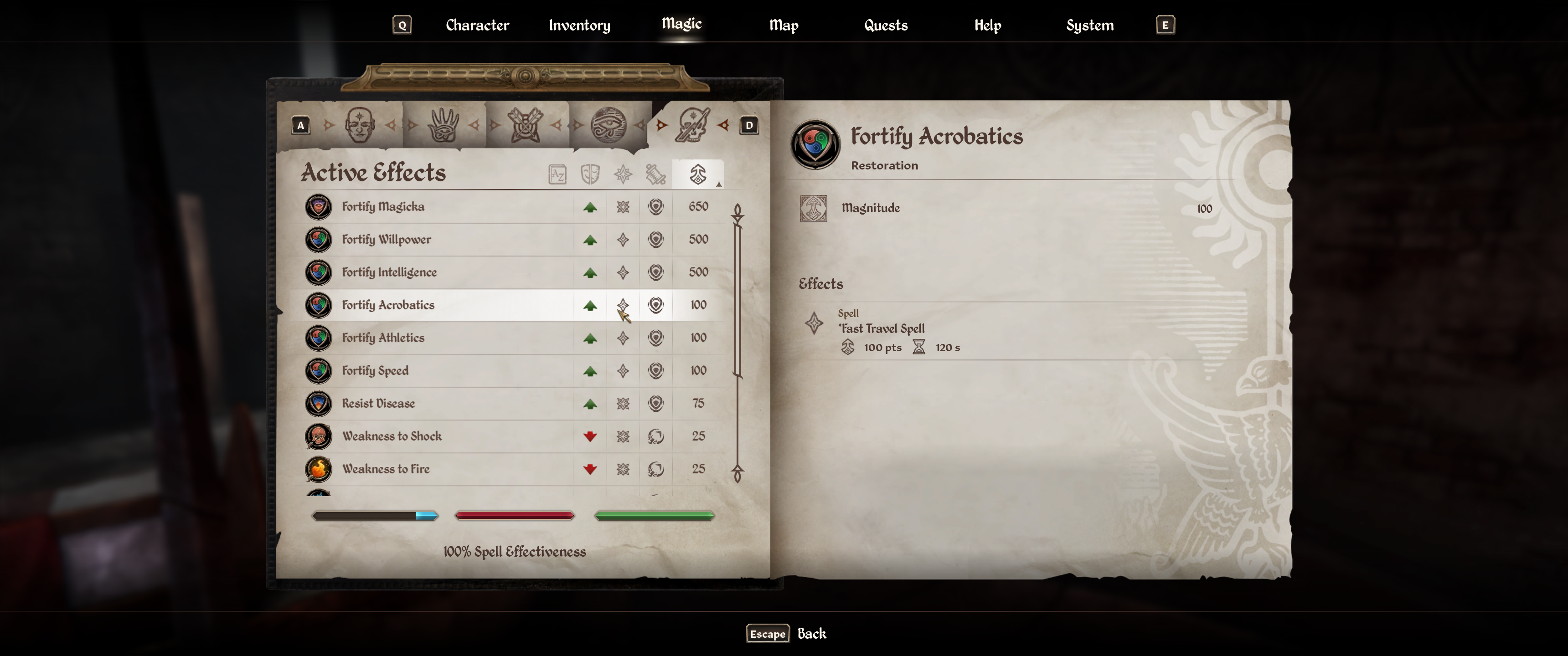 Переходим к ремастеру. Вот что-что, а магия в Обле это лучшее, что может предложить игра. И что сука характерно - это не ломает отыгрыш. Я сейчас сделал 5 одинаковых заклинаний с разными названиями, которые повышают магику, инту и силу воли. От них мой запас магии повышается до ебанутых значений, а сила воли позволяет ей отрегениться. Как итог, мы повышаем запас магики до таких значений, что нам становятся доступны для каста самые поехавшие заклинания. Одно из моих любимых - повышение скорости, атлетики и акробатики на 100 единиц на 2 минуты. Этого с головой хватает чтобы пробежать всю карту.