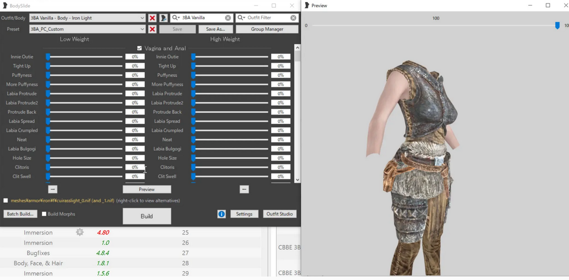 >>2016464 >Проверь в настройках Бодислайда отмечена ли у тебя галочка морфов Стоит >OBody работает с HIMBO, 3BA, UBE. Значит уже не одного, верно? Я имел в виду, что химбо ведь использует только пресеты одного типа тел как бы >https://www.nexusmods.com/skyrimspecialedition/mods/93400 Мне просто скачать это нужно и все? Нет инструкций на странице мода как установить >Не работает физика груди? При использовании брони отключается физика тела, но есть физика этой самой брони и волос. На странице HDT-SMP Vanilla Armors написано об этой проблеме и автор не собирается решать ее. >не может работать хех Сисика работает, если отключить физон брони. Но это выглядит нелепо и я в пользу броньки принял решение. >Идём в дискорд. Ставим Screen Archer Menu А без дискорда можно? Или дай ссылку на дискорд тогда хотя бы >https://www.loverslab.com/topic/78243-list-of-pose-mods/ Так их там целая куча Нет одного большого пака какого-нибудь, чтобы не захламлять? Алсо нужно чтобы они работали в фотомоде...