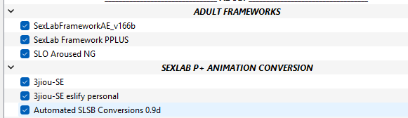 >>2016588 Итак, запустил с пикрил списком, из модов на SL было только это, не считая конверсии без которой у меня бы просто игра не запустилась при наличии Р+ и паков с анимациями. СЛ диалогс, тулз, матчмейкер, СЛАЛ я отключил. Очевидно результат тот же - нихуя, тот же интерфейс обычного секслаба как ты и сказал выше, а не Р+.