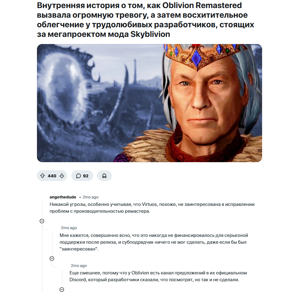 Вроде в треде последние месяцев 5-6 сидели какие-то постеры, но такое чувство будто тут играл только я один за всех, остальные занимались чем? нытьем? Но поймите, это уж ни один разработчик не исправит, проблема тут в вашей голове. За это время еще во всякое другое играть по фентезийным вселенным с мечами и магиями, обожаю эту тему, вот бы жить с эльфами как Толкиен завещал. Стоит выделить серии игр age of barbarian - лютая параша багованная, но атмосфера могла бы хорошая получиться, а также Conan Exiles - это такой майнкрафт для фентезифажиков, прикольно что можно строить города и нпс бомжиков в плен захватывать и они в твоем городе будут работать потом или брать их с собой как полноценных фоловеров. Хотелось бы такое в тесачах, но всё это в подметки не годится, ни скайриму, ни обобобливиону классике/ремастеру. А какой ремастеред красивый, я нигде такого красивого фентези не видел. А геймплей - я играю без харкор режимов и чувствую как реально отжыхаю, а не занимаю какой-то гранитной работой гриндом или прочей хренью. прошлом конечно с модингом пришлось запариться и апгрейдом комп, найстройками, но все это в прошлом и теперь +/- стабильно стало. Гавниш еще играл, но если б не гачазависимость, то давно бы его дропнул, тоже сосет у свитков, да даже у зельды, было б оно сингловой игрой. Так что хватит ныть, меняте прокладки и бегом к психиатру. С вами тут сидеть не хочу, а то заражусь от вас апатией.