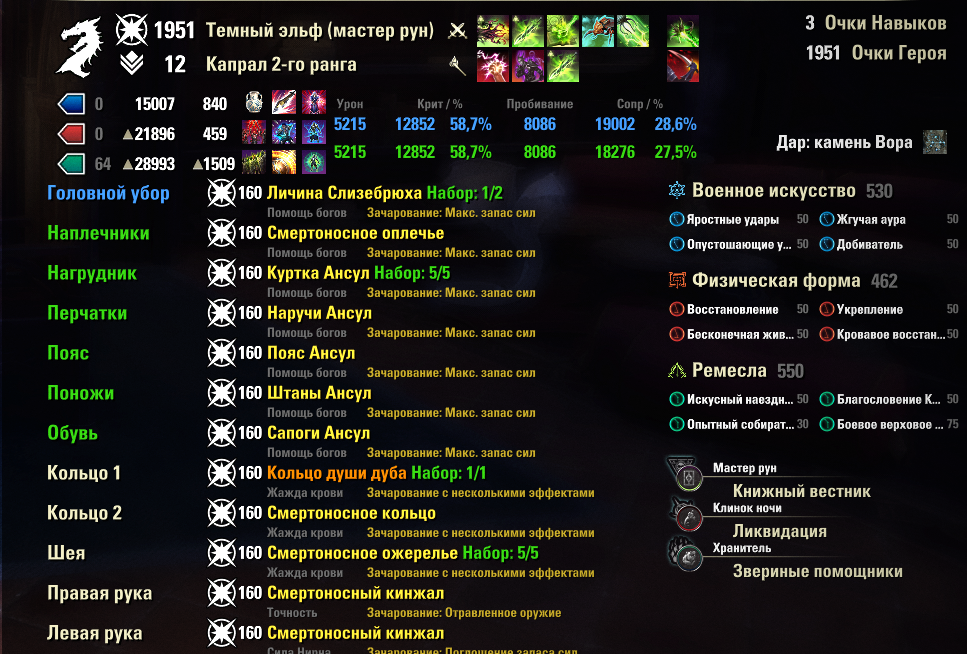 >>2030023 И ещё научись хоть немного вивить/плести бой: когда используешь способность сразу прожимвй обычную атаку (учиться легче в дальнем бою, а наиболее показательно на огненном посохе), таким образом между каждыми способностями должна быть вплетена обычная атака, что очень сильно повысит общий урон в том числе в пвп. Если уж так хочется сеты, то смотри по локациям, которые уже открыл и просто пофарми наборы оттуда, эффективность там вряд ли большая будет, но наличие набора из 5 бонусов конечно поднимет твою эффективность, урон или живучесть в принципе. Например, если у тебя много магического урона (не стихийного, а именно написано в скиллах магический) используй "воительницу" с вварденфела, если хочешь выживаемость и ты не класса Варден(хранитель), то с того же вварденфела собери воина-поэта для бонуса к здоровью: сейчас ещё ивент будет несколько дней и количество Лута увеличено с вварденфела, поэтому его советую, чтобы быстро набрать экипировку, делая ежедневные задания там.
